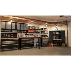 Husky Ready-To-Assemble 96 In. W X 20 In. 3-Drawer Black Workbench With Solid Wood Top And Pegboard