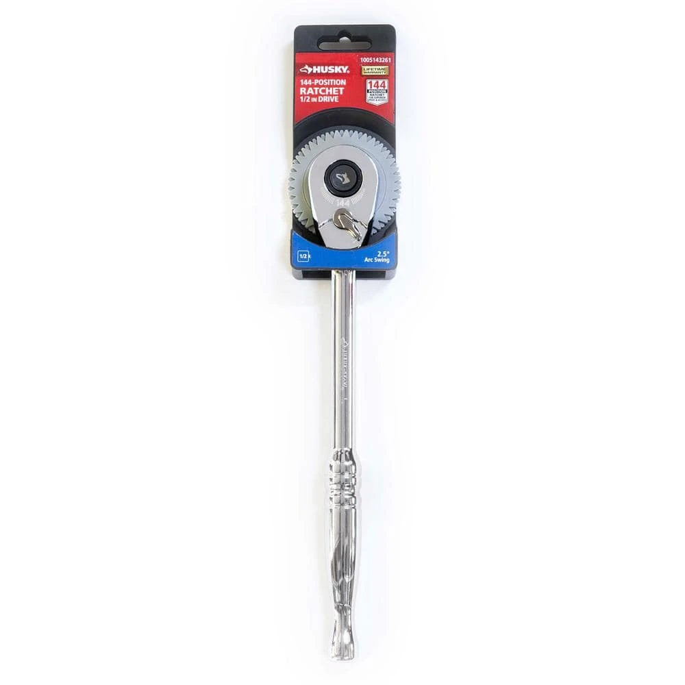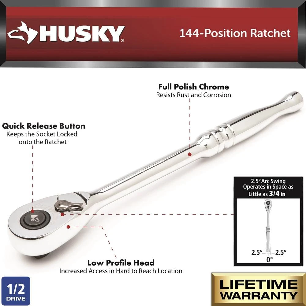 The Husky 1/2 in. Drive 144-Tooth Pro Ratchet is made of alloy steel to provide excellent durability. The finish provides resistance to corrosion. This ratchet has a teardrop-shaped head with a low profile to allow for excellent access to nuts and bolts in tight locations.