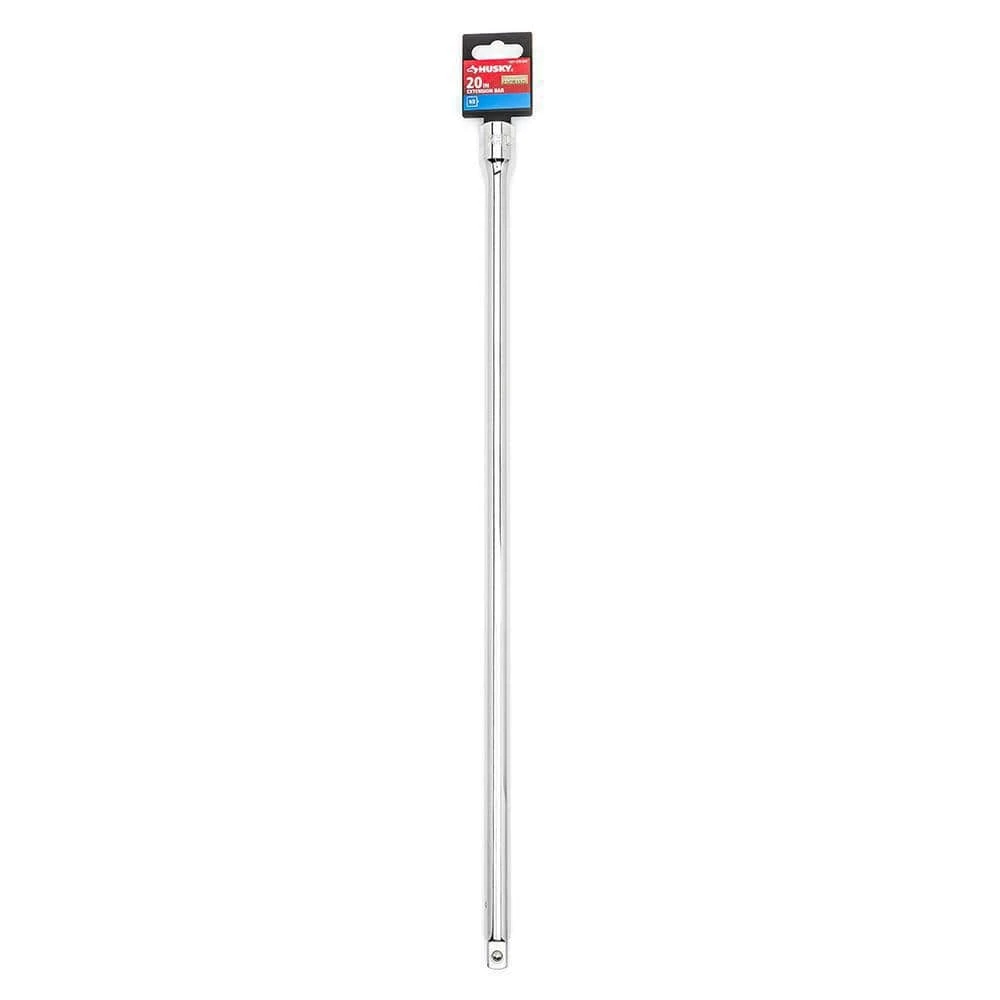 The Husky 1/2 in. drive 20 in. extension provides added length to your sockets for hard-to-reach fasteners. The tool is made of alloy steel for added durability and a long life. The polished chrome finish provides a professional look and helps to resist corrosion.
