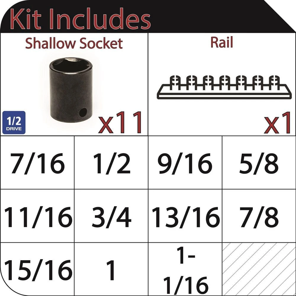 - Set includes (11) 1/2 in. drive standard length impact sockets: SAE – 7/16, 1/2, 9/16, 5/8, 11/16, 3/4, 13/16, 7/8, 15/16, 1, 1-1/16 in