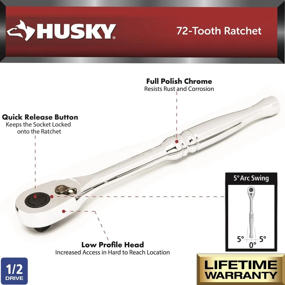 The Husky 1/2 in. Full-Polish Ratchet is made of alloy steel to provide excellent durability. The full polish chrome finish provides resistance to corrosion. This ratchet has a teardrop-style head with a low profile to allow for excellent access to nuts and bolts in tight locations.