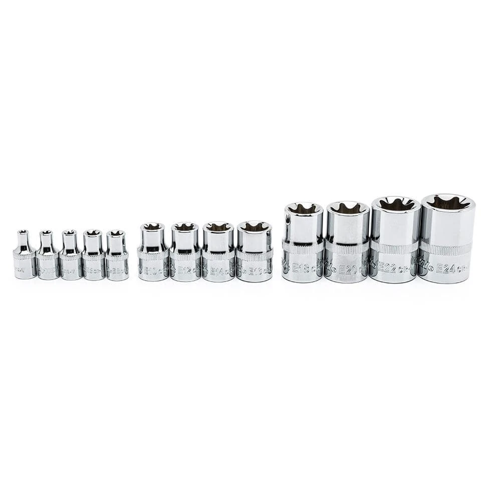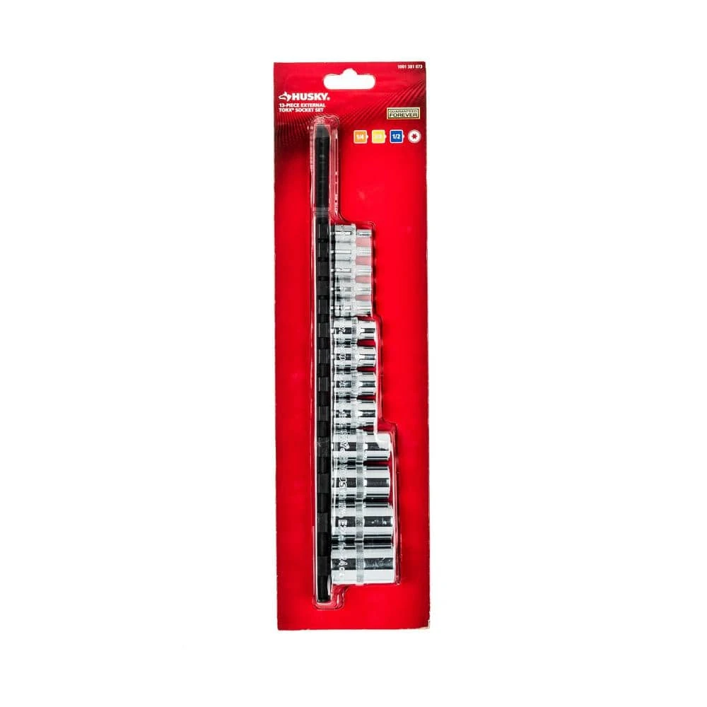 Husky External Torx Sockets are specially designed to be used with Torx-style fasteners commonly found on motorcycles, import vehicles, disc brakes, and electronics. This set contains 13 different sizes spanning from E-4 to E-24 in 1/4