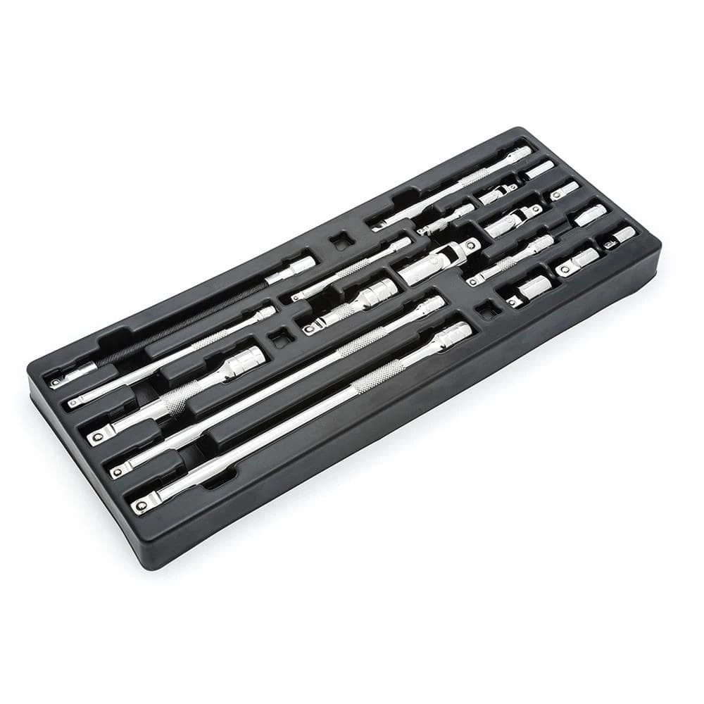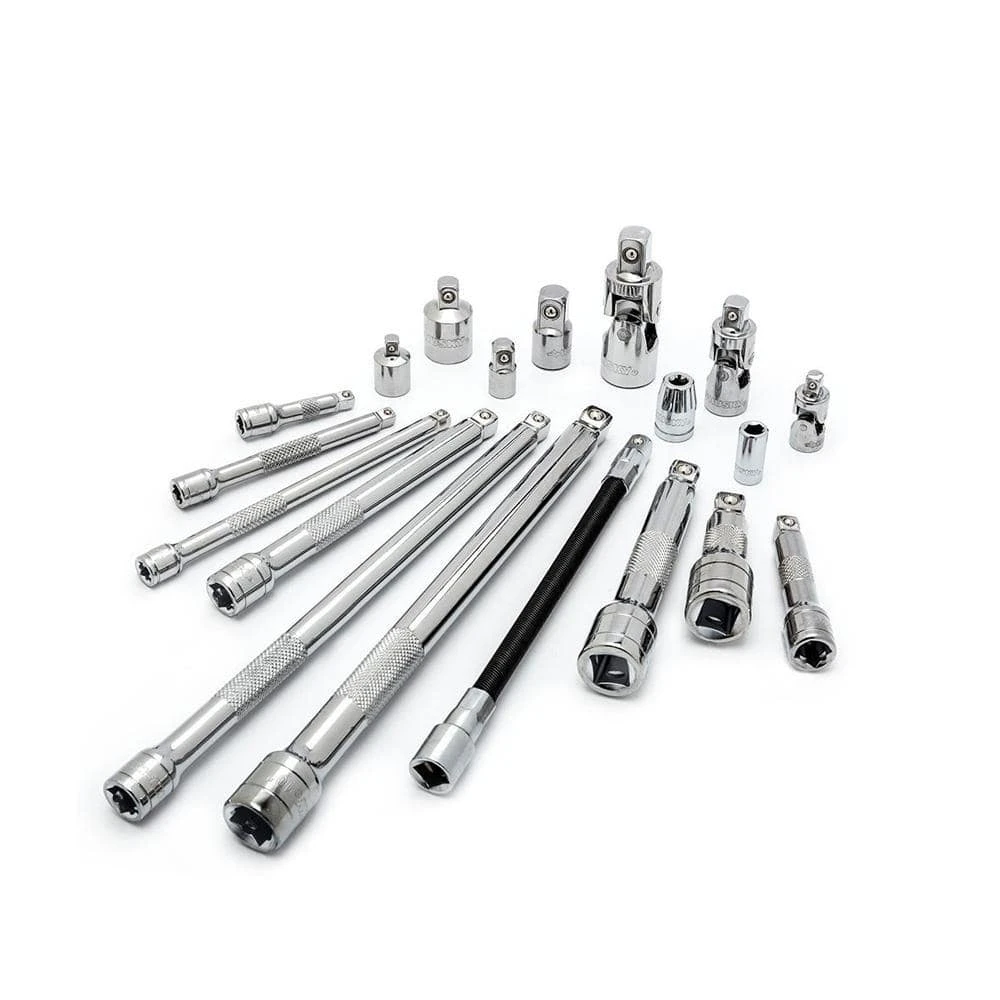 The Husky 19-Piece Complete Accessory Set includes a variety of extensions, adapters and universal joints made from alloy steel for strength and long-lasting performance. The finish provides resistance to corrosion. The chamfered lead-in on both ends allows for quick and easy attachment to the drive tools and sockets. Set includes: 9 wobble extensions- 1/4 in. drive ( 2, 4, 6 in.) 3/8 in. drive ( 3, 6, 10 in.) 1/2 in. drive ( 3 in., 5 in., 10 in.) (1) 3/8 in. drive 8 in. flex extension, (4) drive adapters (1/4F to 3/8M, 3/8F to 1/4M, 3/8F to 1/2M and 1/2F to 3/8M) (3) universal joints, 1/4, 3/8, 1/2 in., (2) bit adapter sockets, 1/4 in. and 3/8 in. drive.