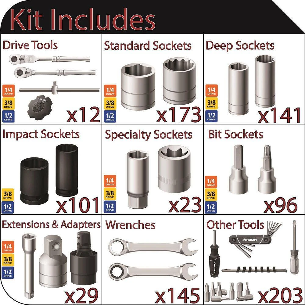 Always have the right tool for the job with this Husky Master Mechanics Tool Set. The set contains 923-pieces and has most of all the tools a mechanic needs. It includes 433 chrome and 101 impact sockets in the most-used drive in. sizes and 145 wrenches including standard combination, ratcheting, flex head ratcheting and specialty. The 13 drive tools, 22 extensions and adapters, and 33 screwdrivers let you spend more time on repairs and less time searching for tools.