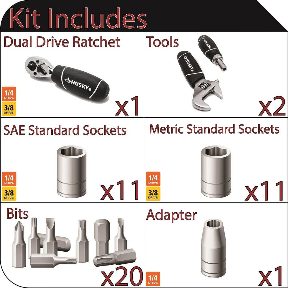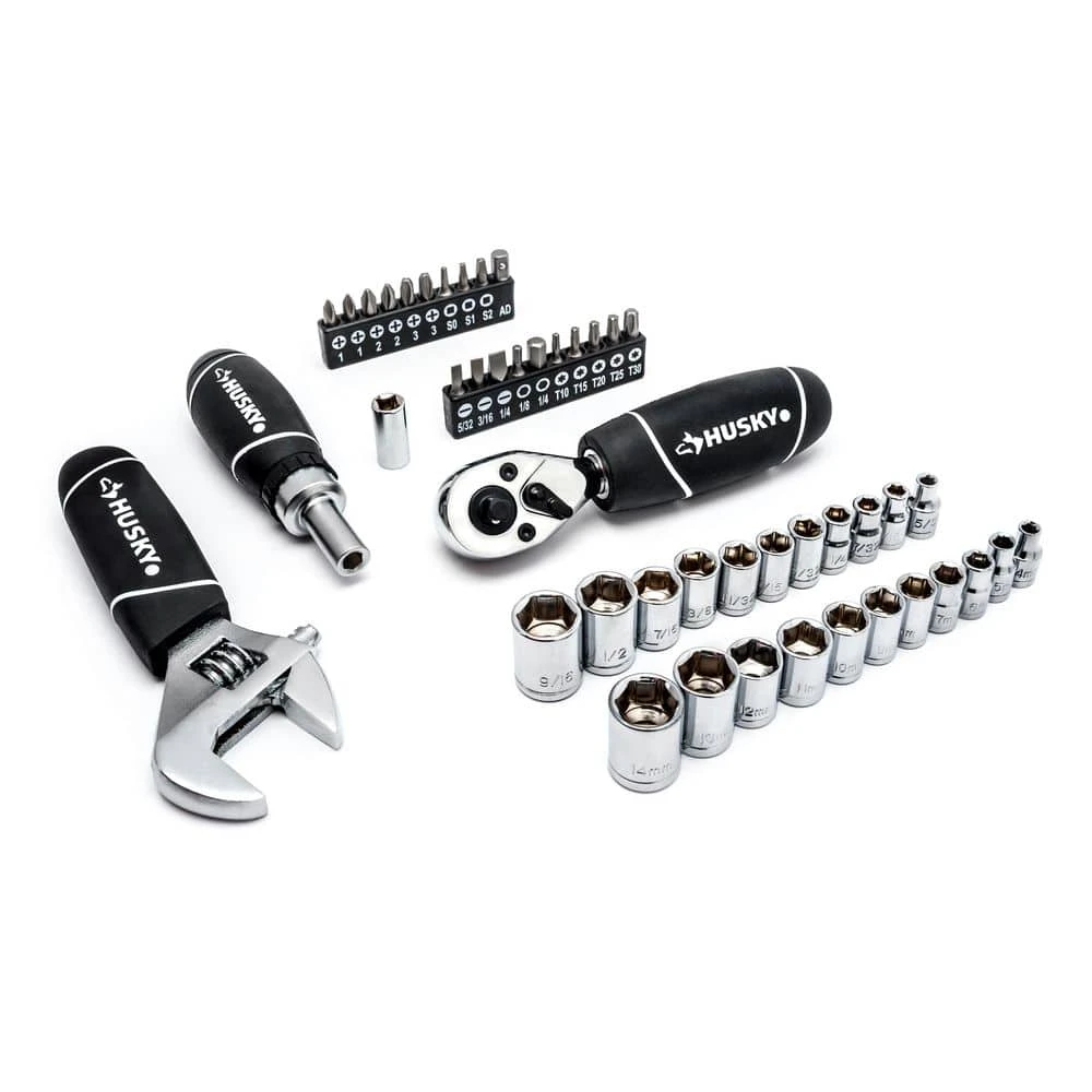 The Husky 46-Piece Stubby Ratchet Set includes 22 sockets and 20 screwdriver bits to handle various jobs around the house. The stubby ratchet features a 1/4