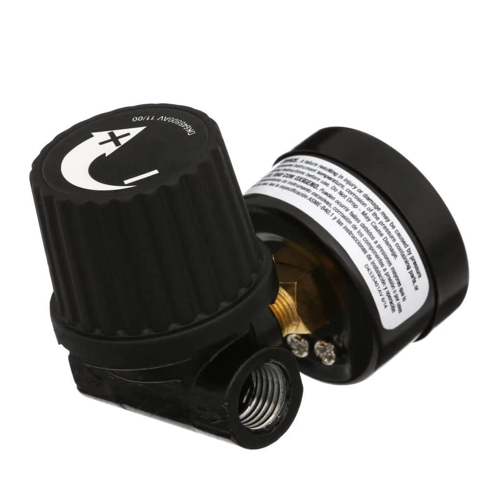 The Husky 1/4 in. Black Air-Compressor Regulator with Gauge accommodates pressures from 0 – 200 psi and helps maintain steady, reliable operation of your air tools. It has a 1/4 in. NPT inlet and outlet and can be adapted for replacement use on practically any portable air compressor. This regulator features a durable housing with an easy-to-read gauge.