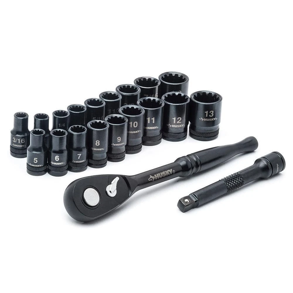 The dual-pawl technology of the 100-position ratchet in this Husky 20-piece universal socket wrench set provides incredible access to bolts and fasteners where other ratchets simply can’t. The 18 knurl grip universal sockets work on six different styles of fasteners, making this the ultimate socket set for any job. This 20-piece set is perfect for professional mechanics, the DIYer working around the house, or in the garage needing access to hard-to-reach fasteners.