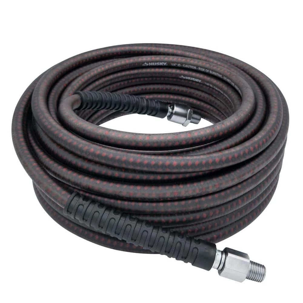 Introducing the Husky 600 psi high pressure air hose that can be used with all high pressure compressors and tools found in the market. The tightly wound internal braids hold up to the increased air pressure, but the hybrid cover and core allow it to remain flexible. Those same cover and core allow this hose to be highly flexible in extreme cold temperatures. Equipped with 2 different swivel fittings to maximize maneuverability and ease of use. The high-end nylon spiral bend restrictors offer true protection and extend hose life.