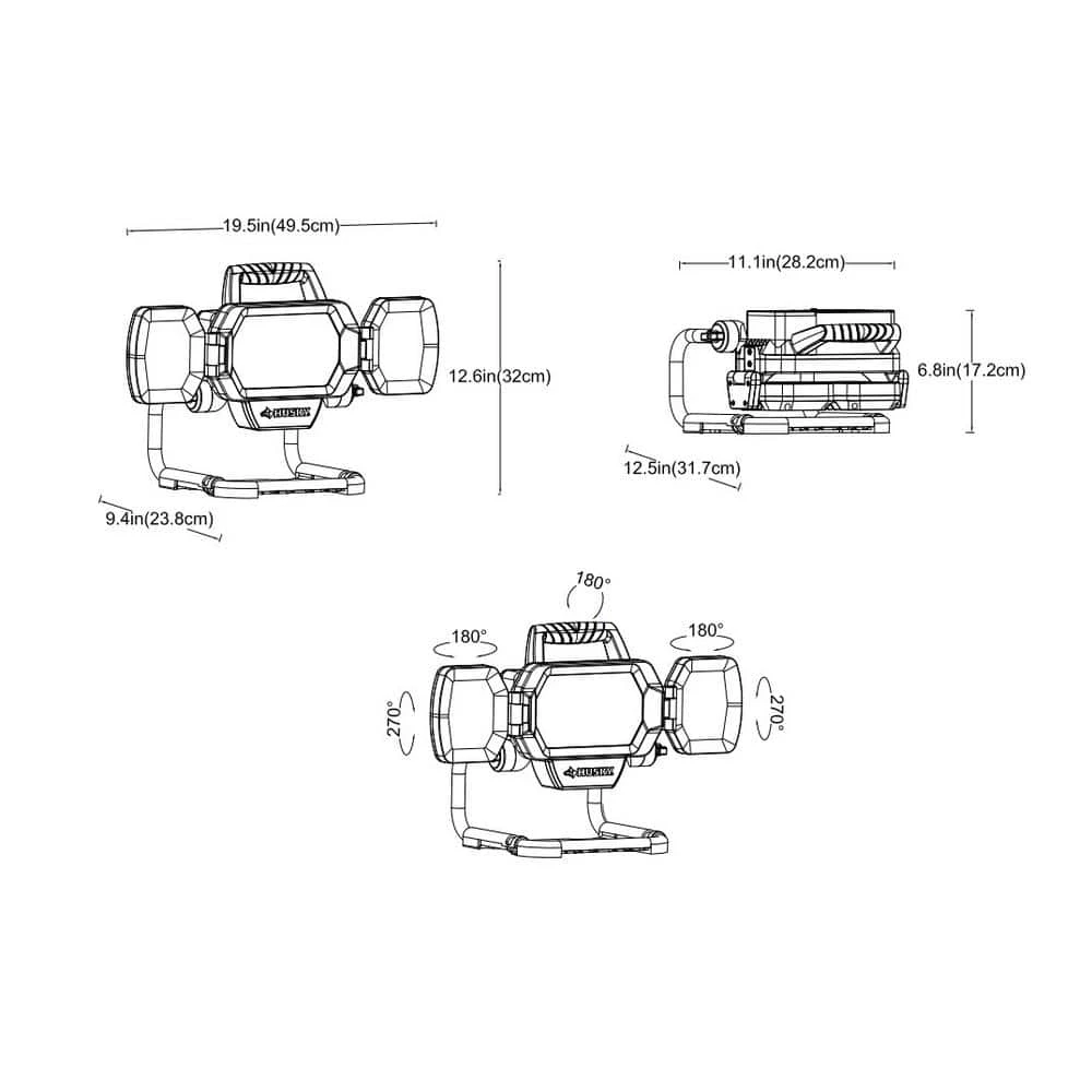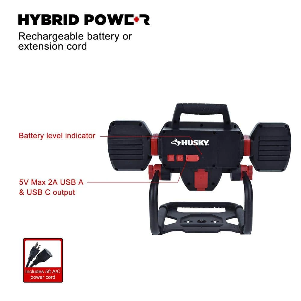 If you want to make sure your work light doesn’t run out of power,this high-intensity dual power LED is perfect for you. It works with integrated battery or using an extension cord. It has a Li-ion battery built in for convenience provides up to 10 hours cordless runtime and is rechargeable. It has the power indicator function to help users know the remaining power of the work light. When the battery power runs out, the work doesn’t stop, just plug included 5ft AC power cord into the wall outlet and keep going. It’s made of durable, die-cast aluminium, making it strong and reliable. Equipped with two adjustable side lights, pivoting 180ยฐand 270ยฐrotation and the middle main light supports 180ยฐvertical rotation by the knob. Also it has 3 selectable CCT from warm white to cool white to make it convenient for whatever your project may be. Bright LED provides flexibility light output that up to 10,000 Lumens with 3 brightness settings under AC power & up to 4,000lm with 3 brightness setting under DC power. It is also compatible to work with Husky tripod mounted (Sold seperately) along with wall hanging mounted. It is foldable design and easy-grip handle allows for easy transport. 5V Max 2A USB A & USB C output can be used for charging other portable devices.Ideal for auto repair, painters, car detailing, construction lighting,and even night market etc.
