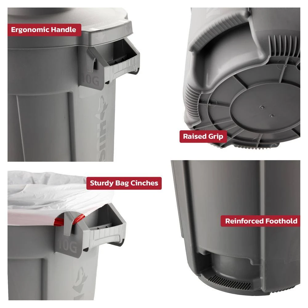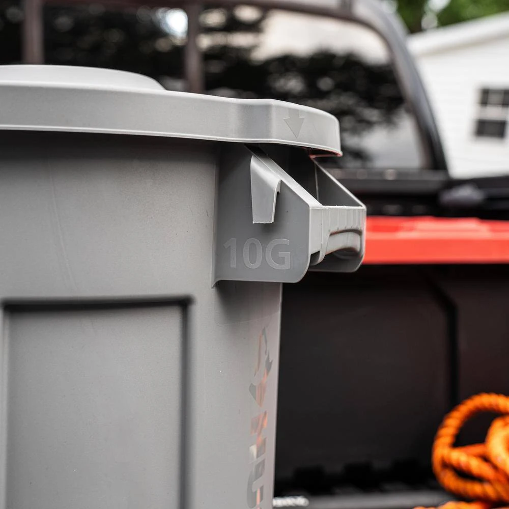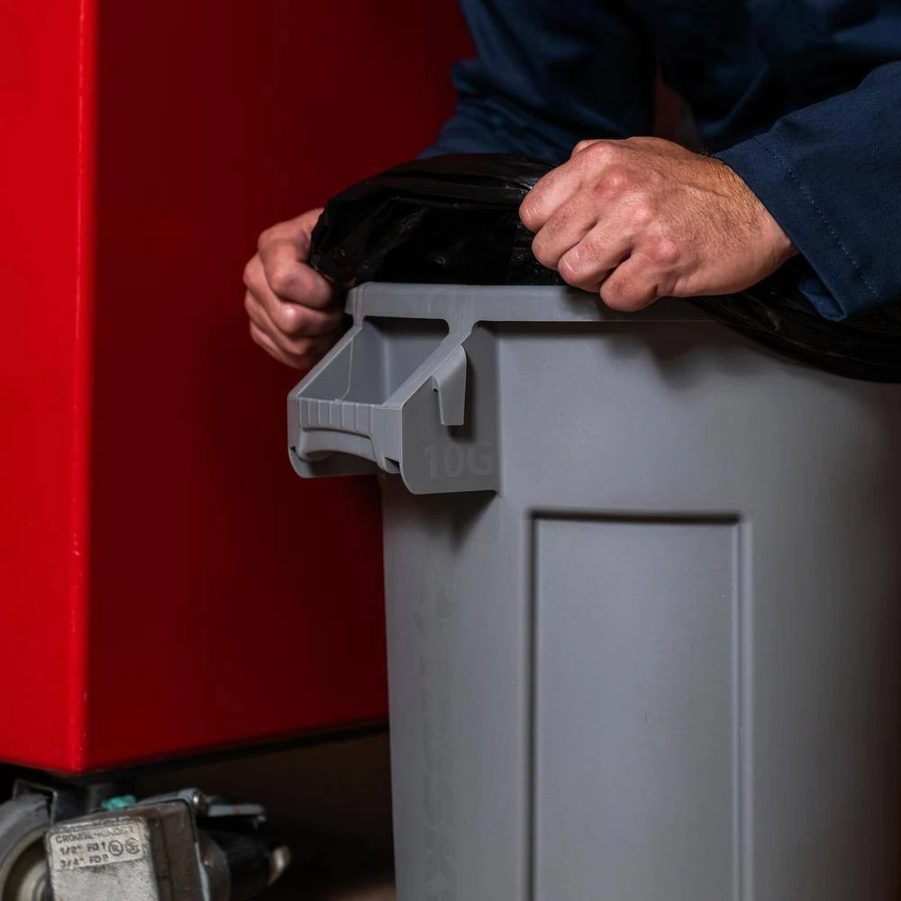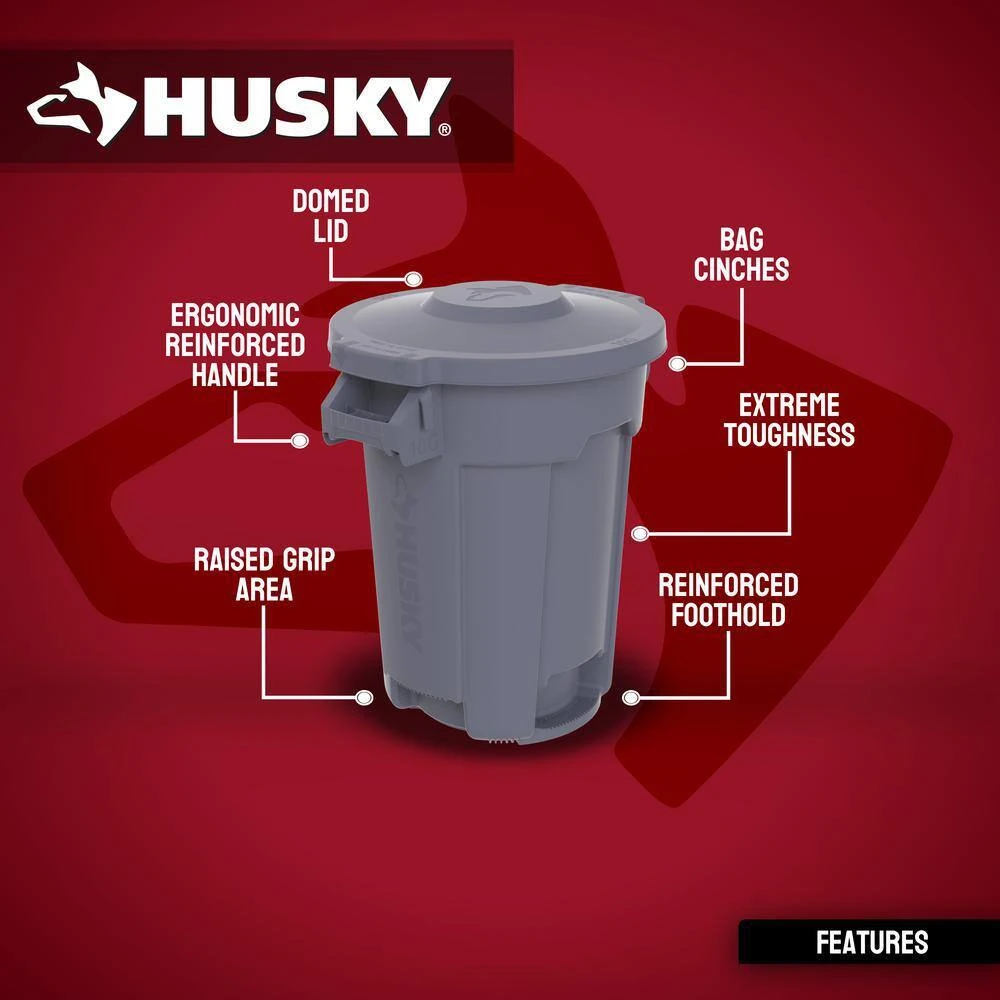 The Husky 10 Gal. trash can is engineered for maximum efficiency and durability even in the toughest environments. With its reinforced foothold and innovative venting channels, removing liners has never been easier. This trash can also feature a raised lower grip area and an ergonomic handle with convenient bag can, making trash disposal a breeze. The domed lid ensures water runoff, while the cans’ ability to nest together maximizes storage efficiency. Emblazoned with bold Husky branding and high-polished feature callouts, including the gallon size, it combines functionality with style. Crafted from a high-quality proprietary resin material that boasts UV resistance, it’s built to withstand extreme conditions without fading, cracking or crushing. The rounded handles, reinforced for extra durability, facilitate easy lifting and moving, even under heavy loads. The reinforced base is specifically designed to endure being dragged over rough surfaces, significantly extending the can’s lifespan and overall durability. Additionally, contoured base handles and a rim enhanced with an integrated rib structure offer improved grip and ergonomics, reducing strain and boosting efficiency during emptying. This trash can doesn’t just hold waste; it’s a testament to Husky’s commitment to quality, designed to make trash management as convenient and reliable as possible.