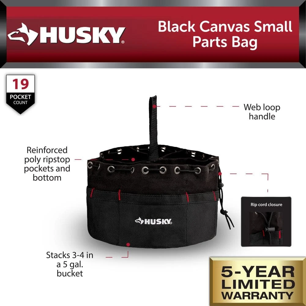 The Husky Black Canvas Small Parts Bag is a classic way to keep your small parts organized. Constructed of heavy-duty canvas, there are 6 divided sections with 19 total compartments to hold various small parts, accessories, drill bits, screws, nails, or more. The bottom and exterior pockets of the tool storage pouch bucket organizer are reinforced with poly ripstop material. You can stack 3-4 of these bags in a 5 Gal. bucket (not included).