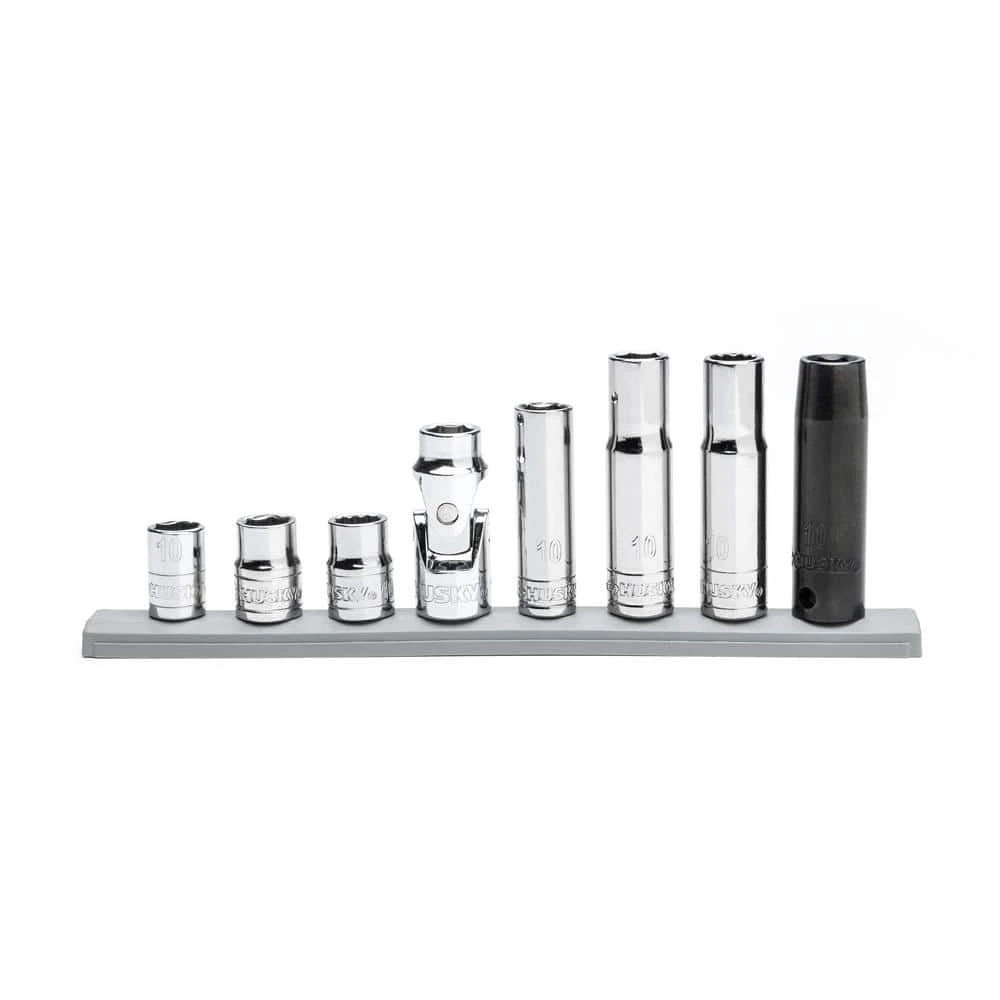 - Set includes eight 10 mm sockets: two 1/4 in. drive sockets (one 6-point standard socket, one 6-point deep socket) and six 3/8 in. drive sockets (one 6-point standard socket, one 6-point deep socket, one 6-point flex socket, one 12-point standard socket, one 12-point deep socket, one 6-point deep impact socket)