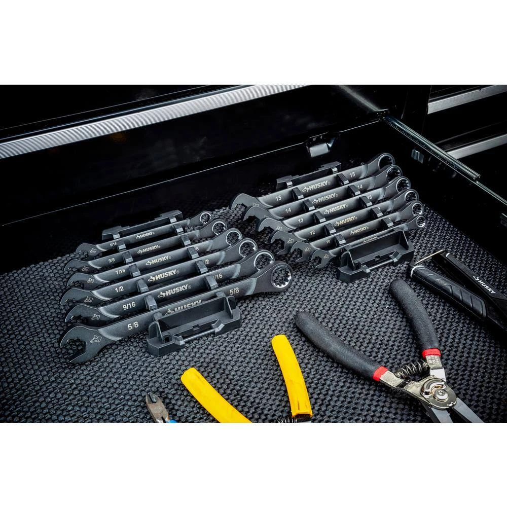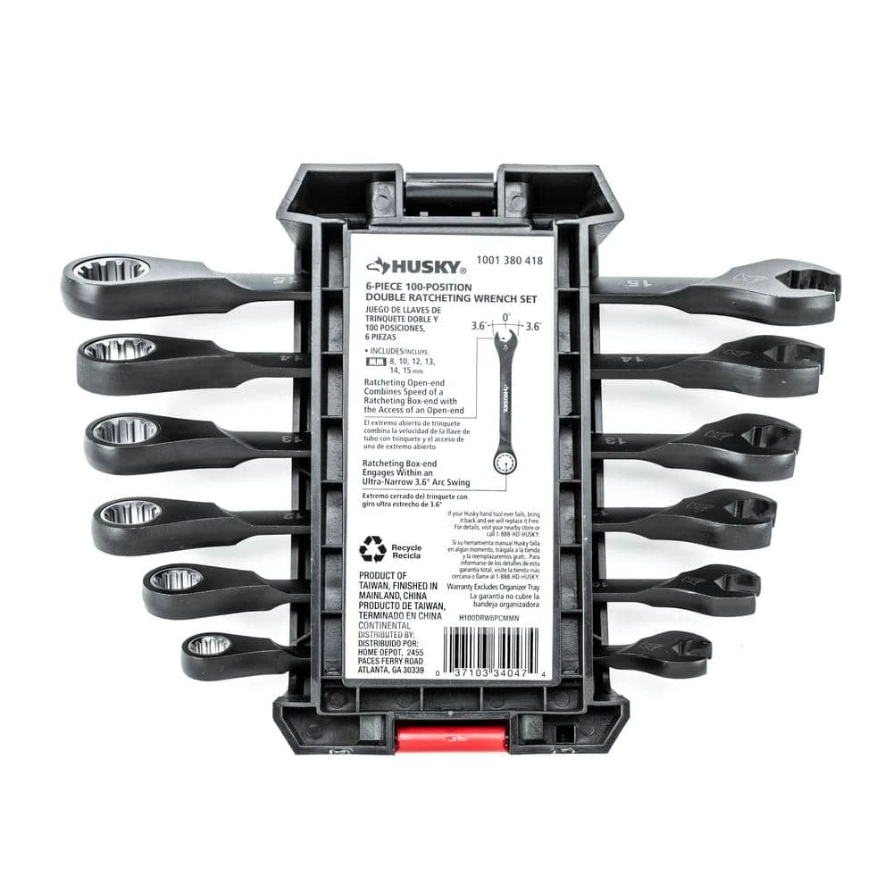 The dual-pawl technology on the Husky 100-Position Double Ratcheting Metric Wrench Set provides access to engage fasteners where other wrenches can’t with its ultra-narrow, 3.6ยฐ swing arc box end. Its 10% longer beam provides increased reach for accessing hard-to-reach fasteners and improves overall leverage. The innovative open-end ratcheting design improves the speed of ratcheting and allows access of an open end without ever removing the wrench from the fastener.