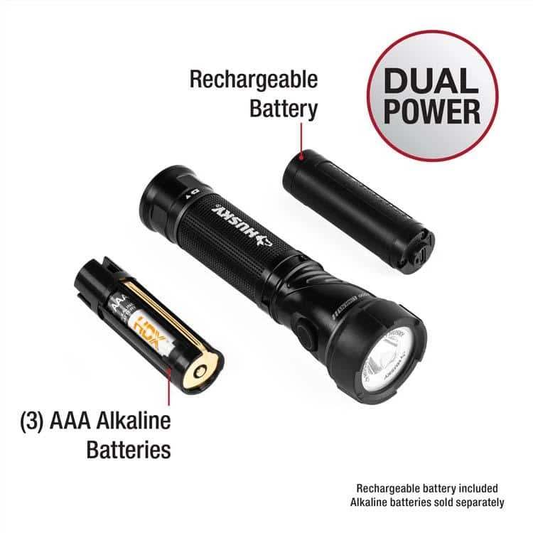 The Husky 1000 Lumen Swivel-Head Rechargeable Flashlight is designed for exceptional brightness and versatility to illuminate small to medium size areas. A swivel-head design rotates 90ยบ for multidirectional adaptability and the magnetic base allows you to mount the light to any metal surface for convenient, hands-free lighting. This multipurpose flashlight features high-power LED technology for brilliant illumination and 6-light modes to adapt to a variety of needs. Dual-Power is a hybrid system that operates on either an included rechargeable lithium-ion battery or 3 AAA disposable alkaline batteries (not included). A USB Type-C port allows for fast input charging with the included cable. The flashlight includes a 1300-lumen turbo mode, 60-hour ECO mode runtime, memory mode recall, and a color-coded battery level indicator for easy power level monitoring. A sturdy clip allows you to easily carry this light on a belt or pocket. Crafted from durable aircraft-grade aluminum, it is impact-resistant, water-resistant with an IP54 rating, tested to ANSI/FL1 standards and backed by a Husky lifetime warranty, ensuring long-lasting reliability and excellent performance in any environment.