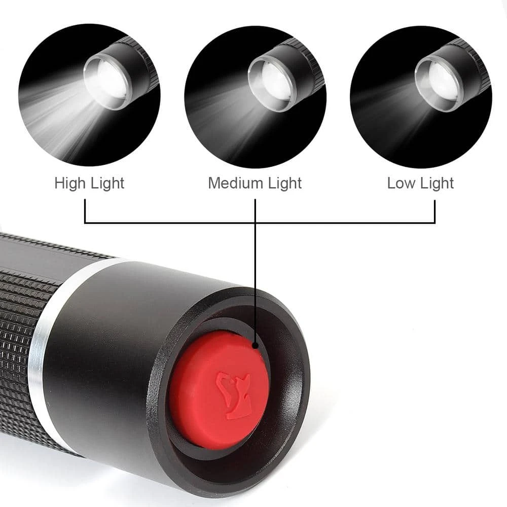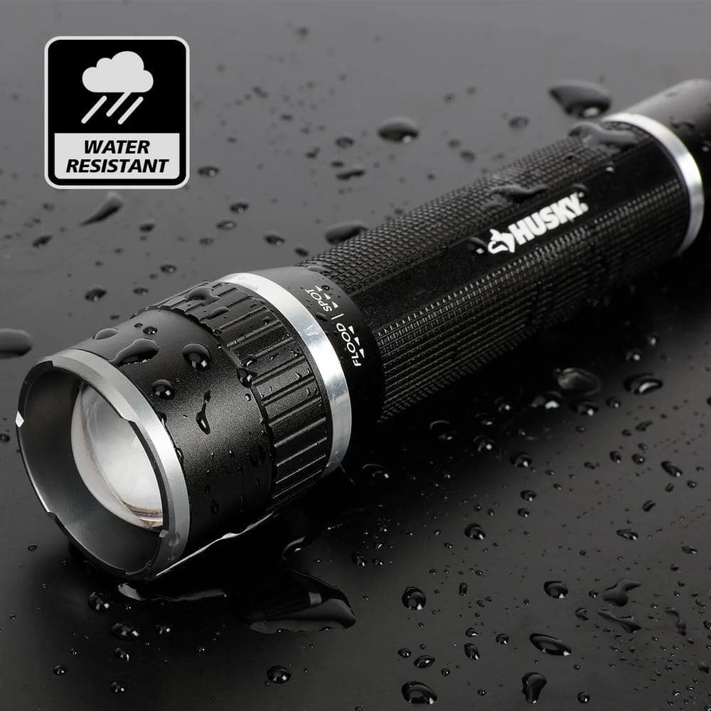 The Husky 1000-Lumens focusing aluminum flashlight features a pocket clip, making it easy to reach and a twist focus from spot to flood beam, giving you full control of the beam size. Change the light beam from narrow to wide with just a twist. The Husky 1000-Lumens focusing aluminum flashlight is powered by 4 AAA alkaline batteries (included). Features include impact resistant, weather resistant, and virtually unbreakable. Three mode capacity: High – 1000-Lumens / 1.5 hours run time / 150m throw; Medium – 300-Lumens / 5 hours run time / 80m throw ; Low – 100-Lumens / 15 hours run time / 50m throw.