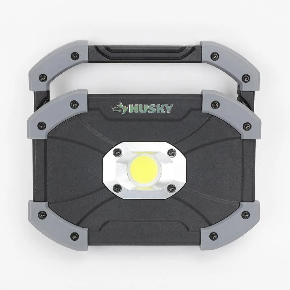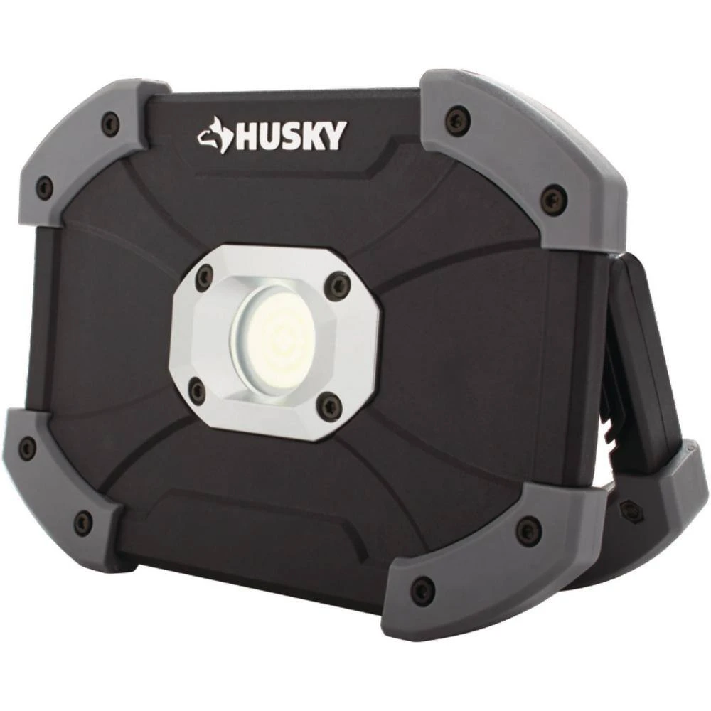 This Husky Utility LED light features a unique design with durable plastic construction. It’s equipped with super bright LED lighting, offering up to 1000 Lumens, 4-hours of run-time and 30 m of beam throw. Its bright illumination and light weight, makes this a perfect light to have for multiple uses. Featured is a 180ยฐ adjustable, foldable handlethat allows for easy carry or positioning at the perfect angle. The battery compartment is easy to open and stores 6 AA alkaline batteries, included.