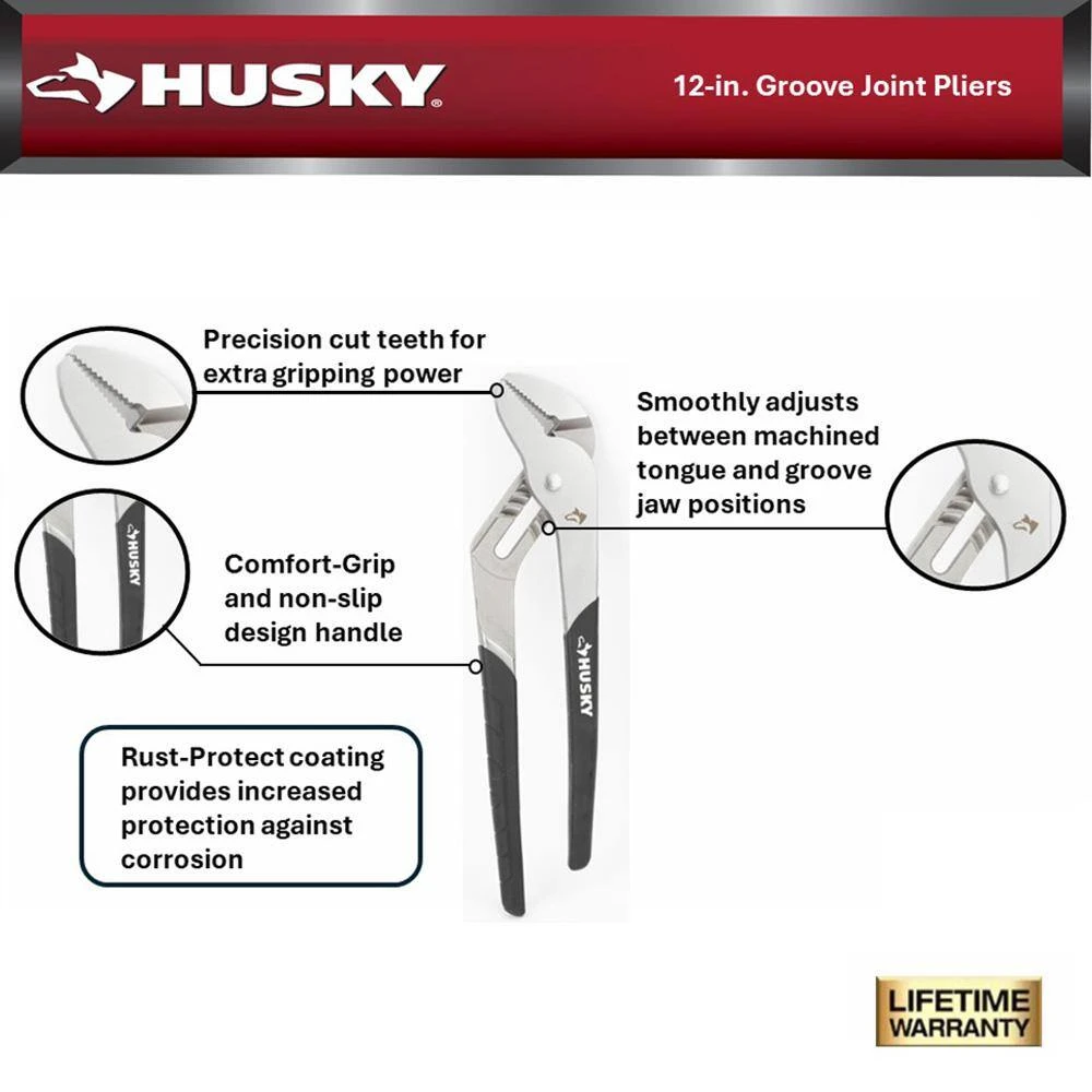 The 12 in. Husky Groove Joint Pliers also known as tongue and groove pliers are often used for gripping irregularly shaped objects. They can also be used for clamping materials. They are also commonly used for turning and holding nuts and bolts. An advantage to this design of pliers is that it can adjust to several sizes without the distance in the handle growing wider. These pliers generally have long handles for increased leverage.