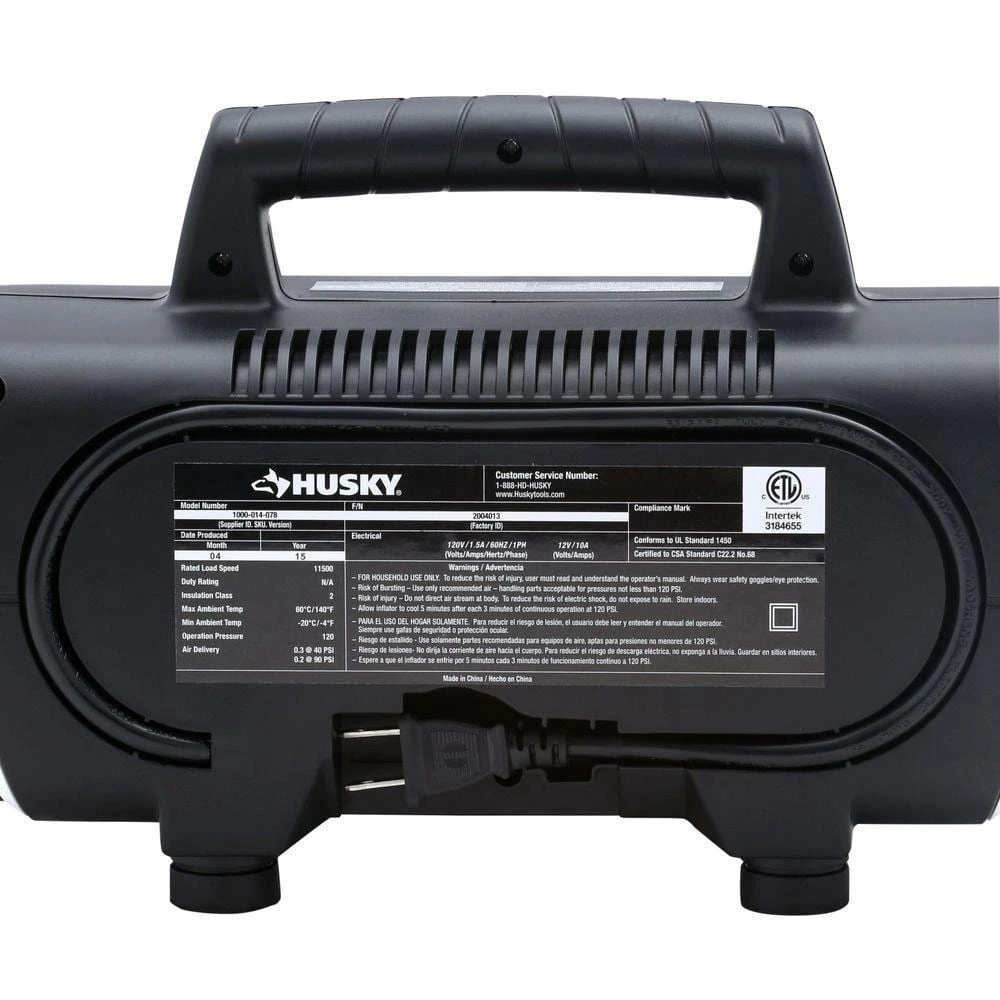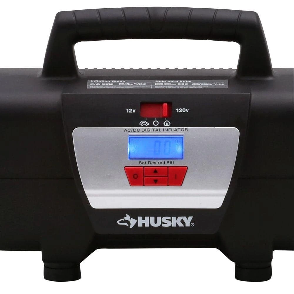 The Husky 12-Volt/120-Volt Home And Auto Inflator inflates vehicle tires, bicycle tires, air mattresses and sports equipment quickly using 12-Volt power source in vehicle or 120-Volt power source at home. The preset digital pressure gauge shuts off automatically when desired pressure is attained. It is lightweight, portable and easy to store.