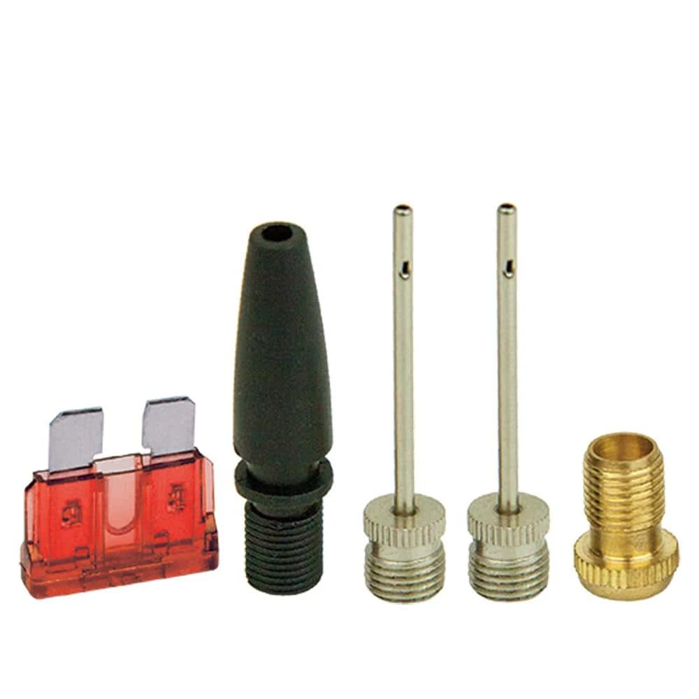 - Includes: Presta valve adaptor, sports needles, mattress nozzle, 2 spare tire valve caps, and a spare fuse (15 AMP blade fuse)