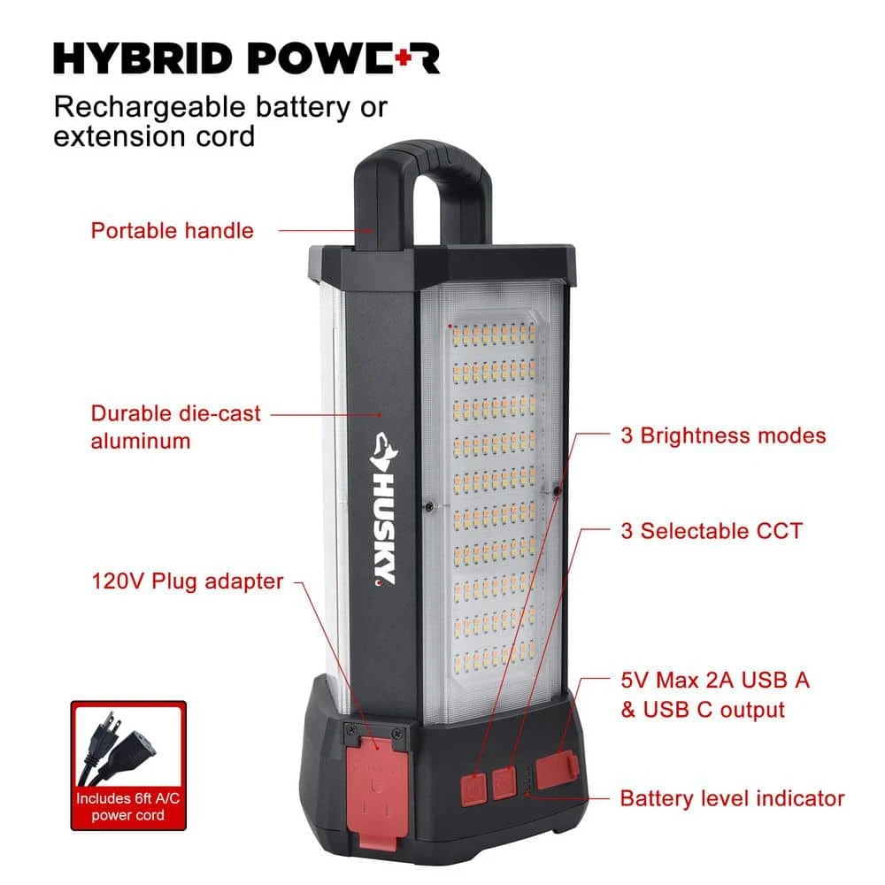 If you want to make sure your work light doesn’t run out of power,this high-intensity dual power LED is perfect for you.It works with integrated battery or using an extension cord.It has a Li-ion battery built in for convenience provides up to 10 hours cordless runtime and is rechargeable.It has the power indicator function to help users know the remaining power of the work light.When the battery power runs out, the work doesn’t stop,just plug included 6ft AC power cord into the wall outlet and keep going.It’s made of durable, die-cast aluminium, making it strong and reliable. Three lighting panels provide wider illumination range. Bright LED provides flexibility light output that up to 14,000 Lumens with 3 brightness settings under AC power & up to 4,000lm with 3 brightness setting under DC power. Also it has 3 selectable CCT from warm white to cool white to make it convenient for whatever your project may be. Multiple mounting options including integrated handle for portable, rafter metal hook for hanging and ยผ -inch 20 thread mounting hole fitting for tripod (Sold separately). 5V Max 2A USB A & USB C output can be used for charging other portable devices.Ideal for auto repair, painters, car detailing, construction lighting,and even night market etc.