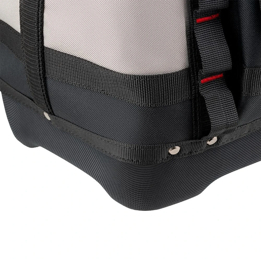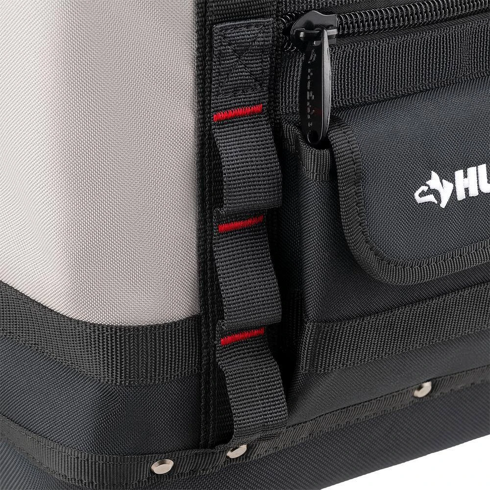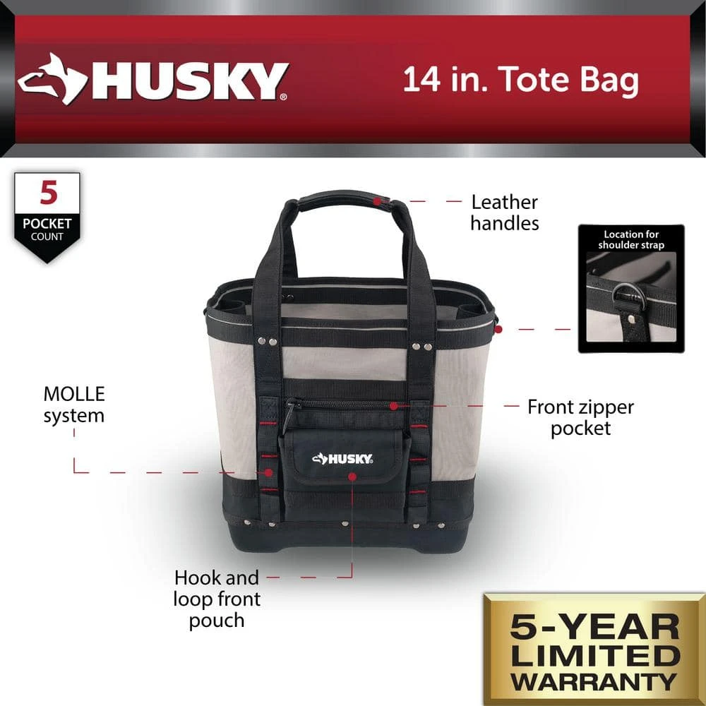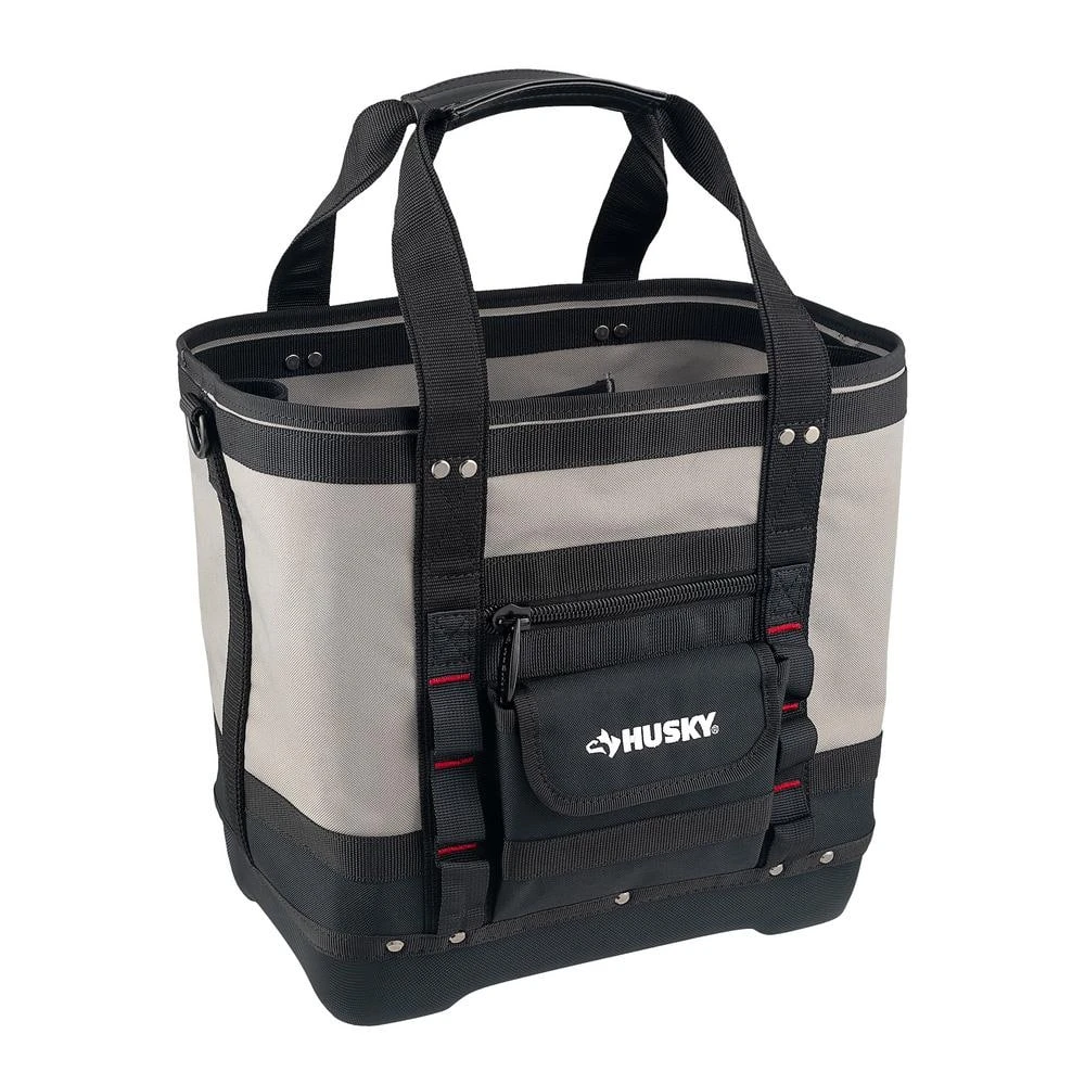 The all-new Husky 14 in. Tote Bag is the perfect addition to your Husky collection. Featuring a molded bottom, this tote tool bag can withstand many different environments, all while giving easy access to the contents inside. Comfortable, leather carrying handles make this tool tote bag ideal for comfortable carrying with or without gloves. A front pocket is perfect for your cell phone, wallet, or keys. The zippered pocket is perfect for anything you might worry about losing on the jobsite. Load this tool tote up and take it anywhere. Be sure to add the latest Husky product to your collection today.