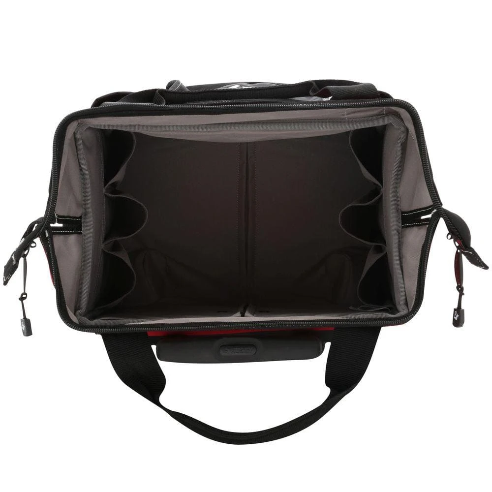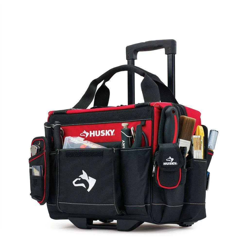 The Husky 14 in. Rolling Tool Tote features a heavy-duty telescoping handle and two wheels for easy mobility. A large main compartment provides easy access to tools and accessories, while 13 storage pockets make it easy to keep your items organized. This rugged design holds up to 80 lbs. and is durably is crafted with water-resistant material, making it a perfect choice for rough job site conditions.