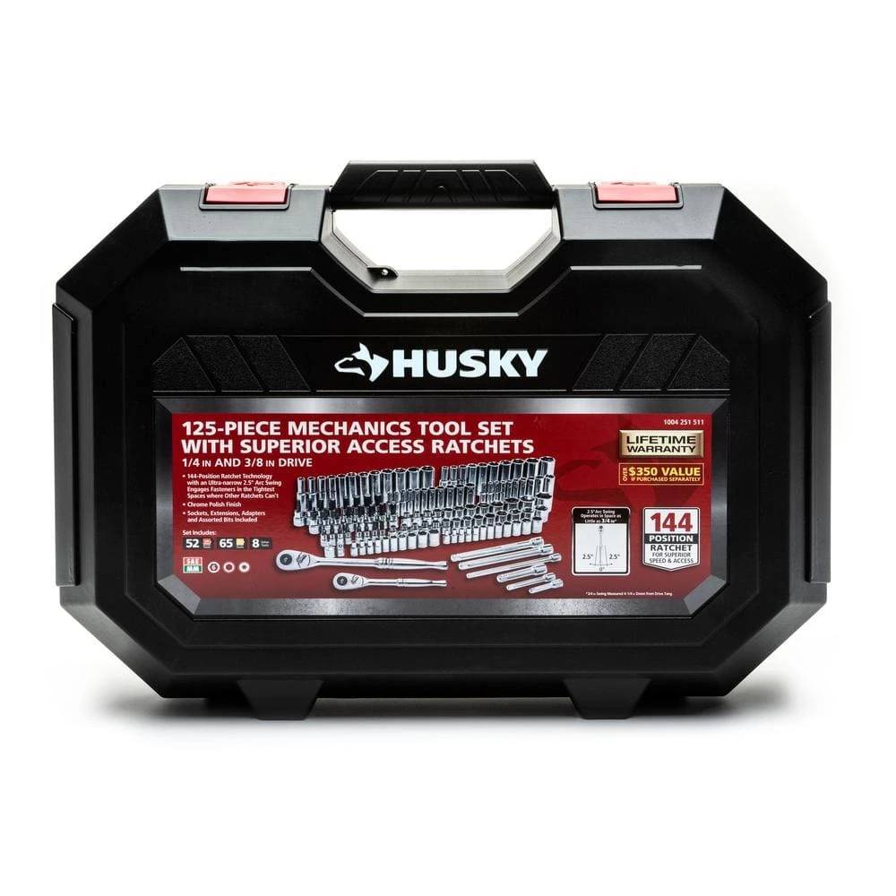 The dual-pawl technology of the 144-position ratchet in this Husky 125-piece mechanics tool set provide industry leading access to bolts and fasteners where other ratchets simply can’t. The 91 standard and deep 6-point sockets work to get the job done. The Husky 125-piece 144-position mechanics tools set is perfect for professional mechanics or the DIYer working around the house or in the garage needing access to hard to reach fasteners.