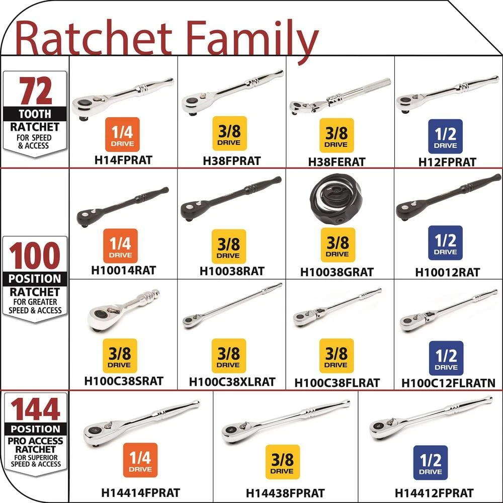 - Pro access ratchets have industry-leading 2.5ยฐ arc swing, turning a fastener in less than 3/4