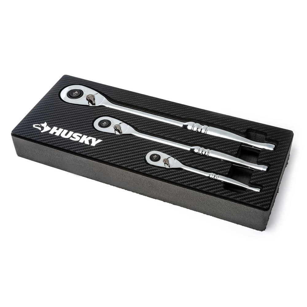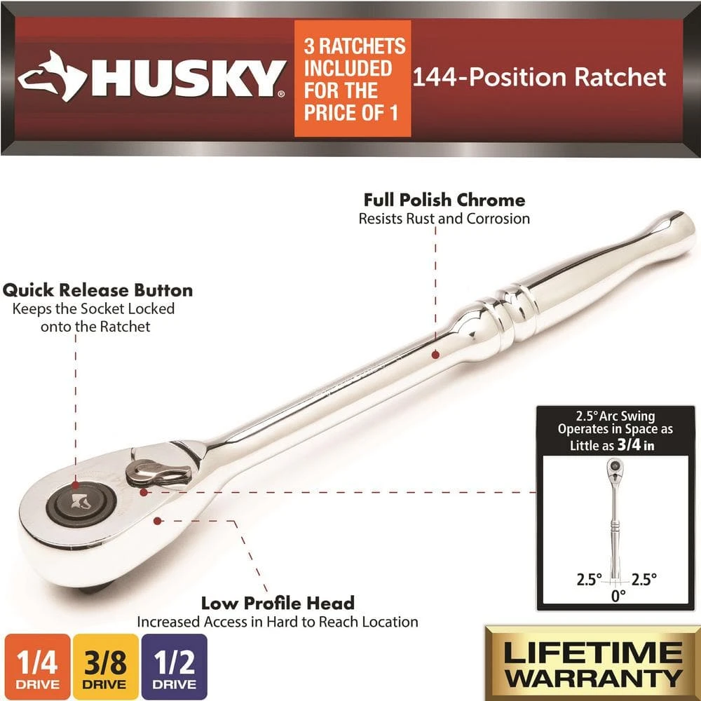 The Husky Full-Polish 144-Position Ratchet Set is made of alloy steel to provide excellent durability. The set includes 1/4