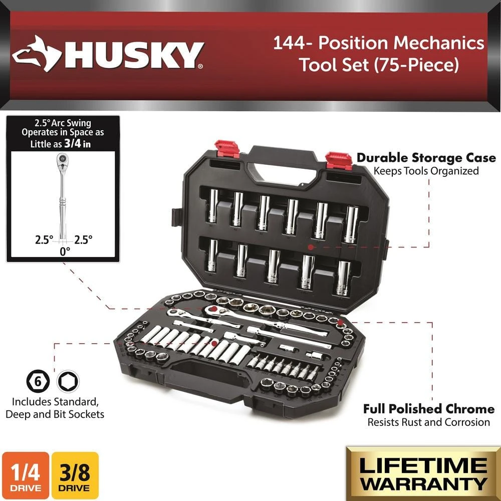 The dual-pawl technology of the 144-position ratchet in this Husky 75-piece mechanics tool set provides industry-leading access to bolts and fasteners where other ratchets simply can’t. The 68 standard and deep 6-point sockets work to get the job done. This set is perfect for professional mechanics or the DIYer working around the house or in the garage needing access to hard-to-reach fasteners.