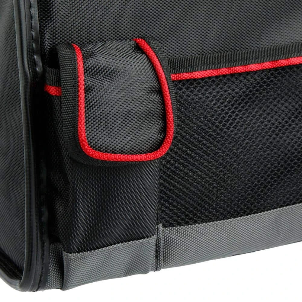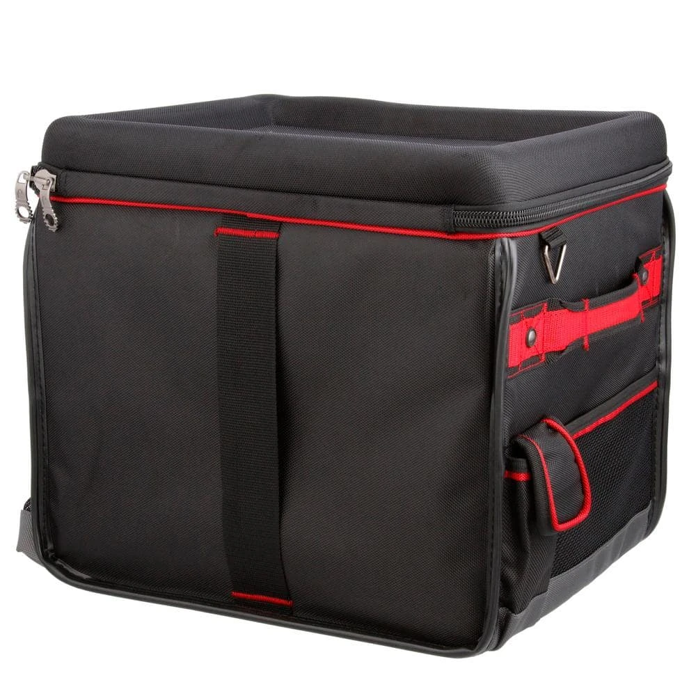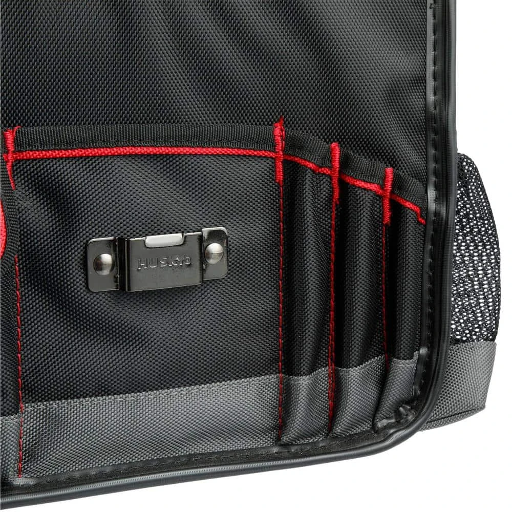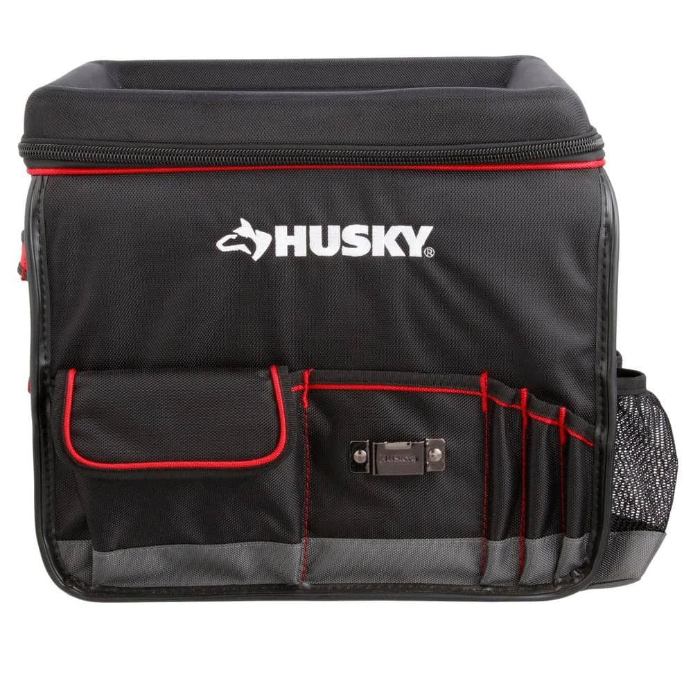 Make working from your vehicle easy with the Husky Pro Mobile Office Organizer. It belts into your passenger side and features a molded lid with raised edges, keeping items from sliding off and providing a flat work surface. To hold your laptop, tablet and file folders if offers padded dividers. Multiple exterior pockets hold notebooks, pencils, water bottles and other necessary items. For security and durability, it includes a main compartment with lockable zippers and a water-resistant 1680D fabric with fully reinforced edges, preventing wear on the corners. Easily transport this organizer with dual, riveted truck handles.