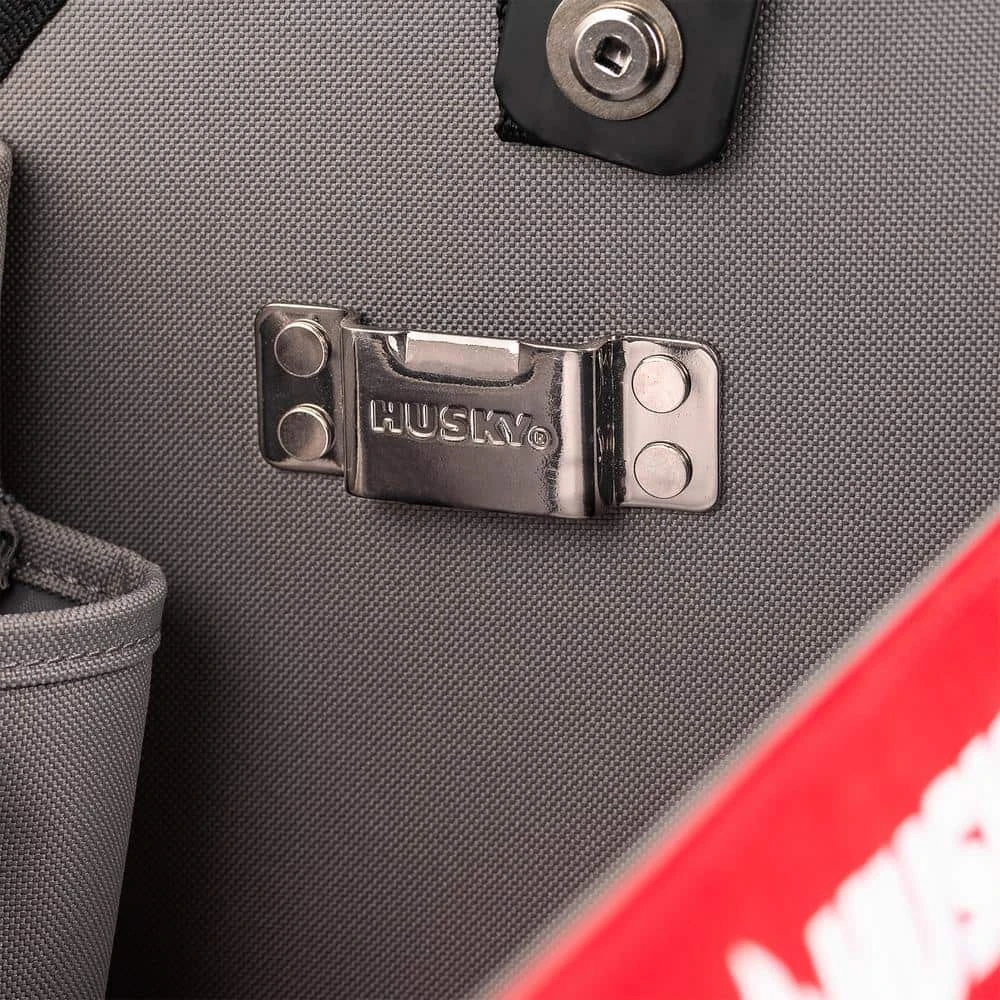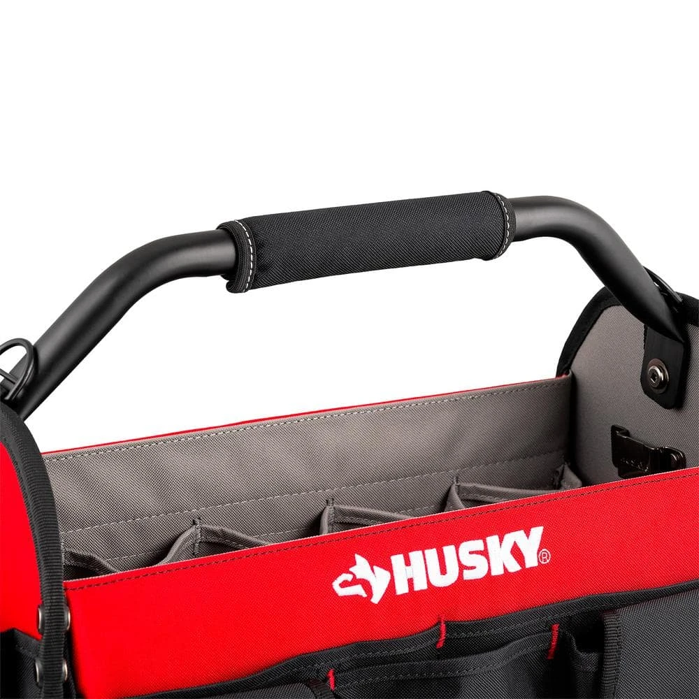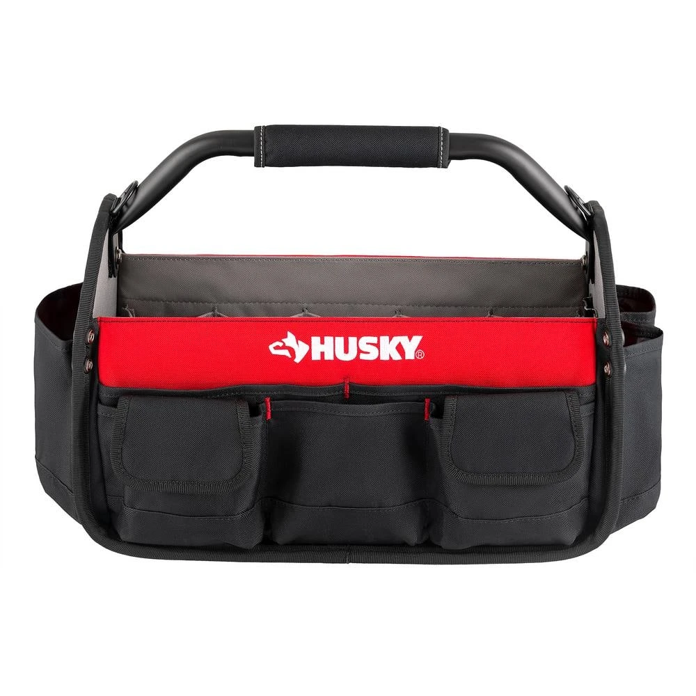 The Husky 17 in. Open Tool Tote offers an Open Top with a Rotating Handle allowing for full access to tools stored inside. This item also offers reinforced pockets for durability through years of use. The Husky 17 in. Open Tool Tote with Rotating Handle is the perfect fit for anyone in need of open top storage and long-lasting durability. This tote is the perfect addition to your Husky Tool Bag collection. Constructed of 600 Denier water resistant material. This product carries a 3-year limited warranty.