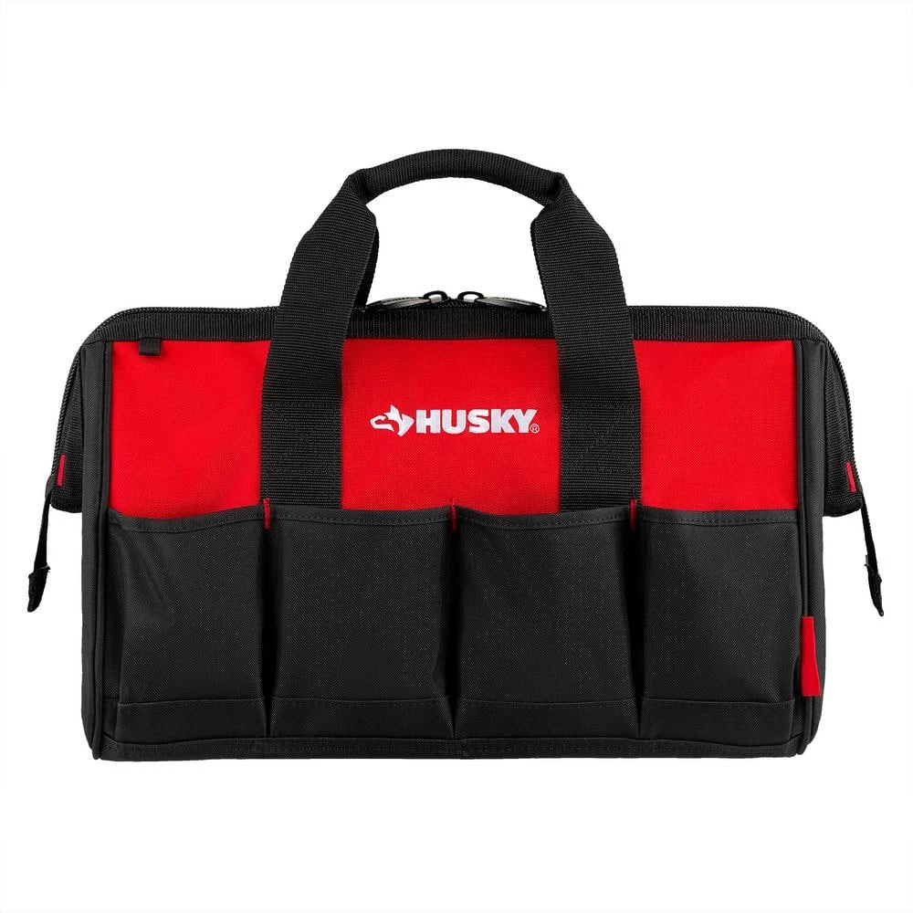 The Husky 18 in. Tool Bag is constructed of 600 denier, water-resistant material and includes 14 large pockets. This tool bag has a wide mouth opening with a dual zipper top for easier access to the interior. A large main compartment is for larger tool storage. Use the Husky 18 in. Tool Bag with your Husky tool pouches. This product carries a 3-year limited warranty and includes a shoulder strap.