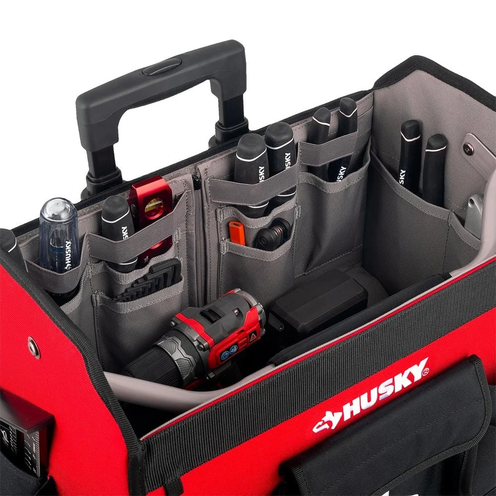 The Husky 18 in. Rolling Open Tool Bag is as heavy-duty as it gets. This tool bag features a telescoping handle for easy transporting ability. The two 7 in. wheels are extremely durable and perfect for rolling over any obstacle while on the jobsite or DIY project. This rolling tool bag also features durable front feet while allow the entire bag to stand freely and securely while you are at work. The padded handle grip allows you to pick the tool bag up to move wherever needed and load into a vehicle with ease. The 600-denier water-resistant material is perfect for protecting the tool bag and hand tool contents inside throughout multiple weather conditions. Be sure to add this rolling tool bag to your Husky collection today.