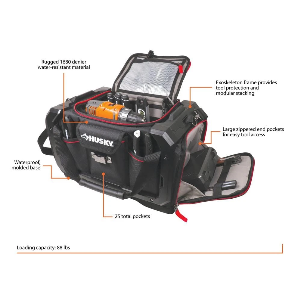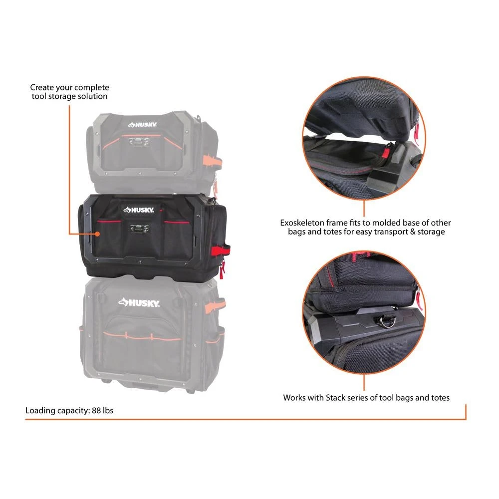 The HUSKY STACK hybrid tool storage system combines the best of hard-sided and soft-sided tool storage, protection and organization. The exoskeleton frame provides tool protection and the 25 total pockets allow tools to be organized for efficiency on the jobsite. The waterproof molded base fits to the STACK TOOL BAG exoskeleton frame for stacking multiple bags providing easy storage and transport. Dual zippered end pockets open wide for easy tool access. Constructed from rugged 1680 denier, water-resistant polyester with reinforced wear points for long-term durability. The 19 in. STACK TOOL BAG works with the HUSKY STACK system of products to create your complete tool storage solution.