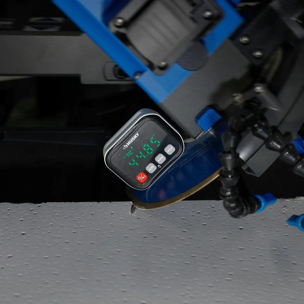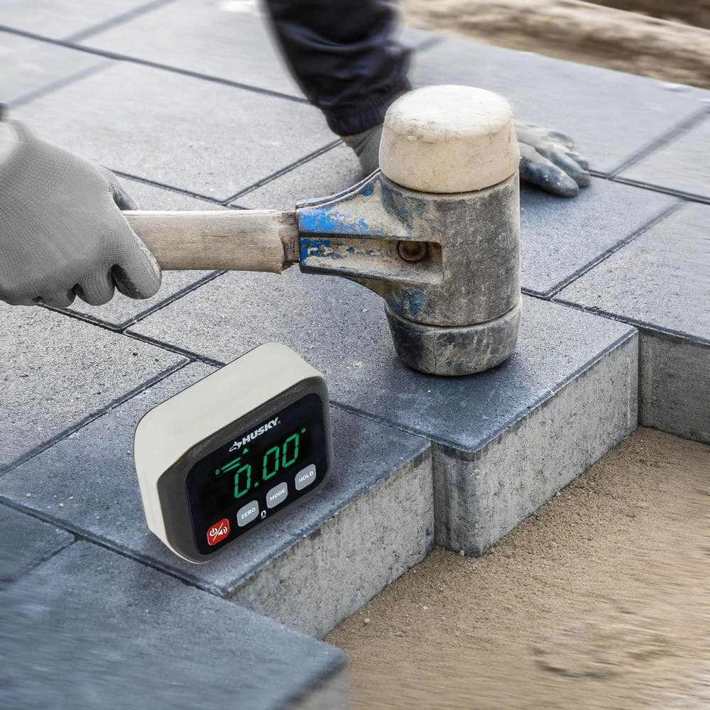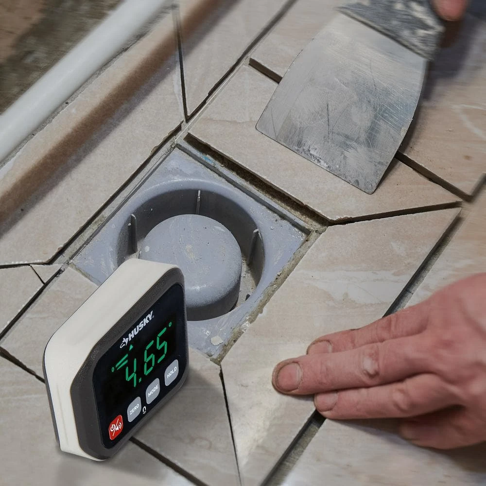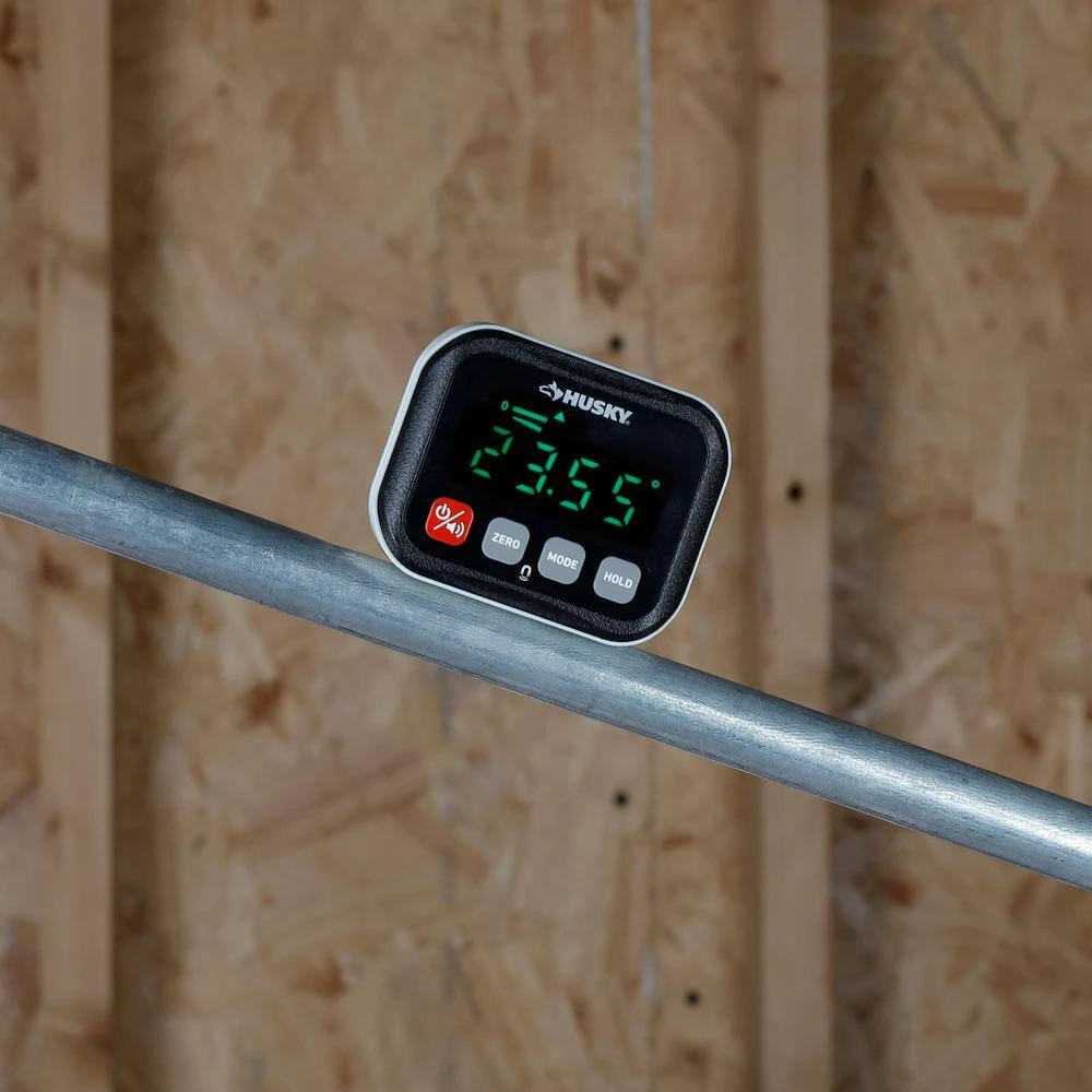 This Digital Angle Gauge is the newest tool you need in your tool kit. More compact, more precise and more versatile than a bubble level. It can replace your torpedo level for most applications. More importantly, it gives you crucial information about the slope of a surface. This is critical for installing showers that slope towards a drain, a patio that drains away from the house, a ramp that’s wheelchair accessible, a stairway or driveway at the perfect elevation. Use it on flooring projects to ensure the installation meets the manufacturer’s specifications, use it to fine tune and calibrate your mitre saw or your photo frames. It has a V-groove on all sides and a magnetic base, making it perfect for installing conduit or pipe. It provides an audible beep when achieving perfect level, so you can use it even when you have your hands full or working above your head. The display rotates based on which direction you are holding the device, so you can always get a good reading.