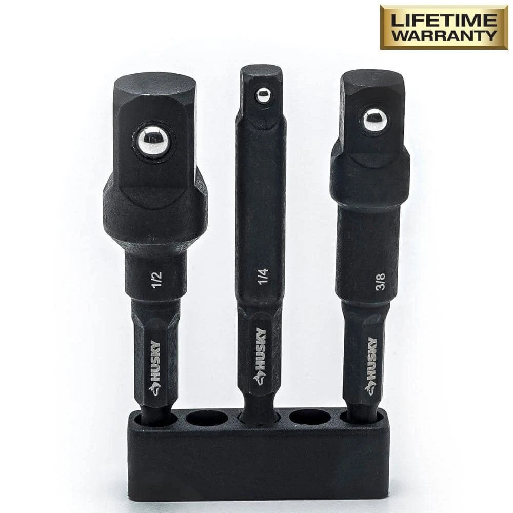 Add this must-have Husky 1/4 in. Drive Impact Driver Socket Adapter Set to your DIY or professional toolbox. To be used with impact drivers and sockets, these adapters work on 3 different drive sizes of standard and deep sockets (1/4 in., 3/8 in., and 1/2 in.). For strength and durability, they are made of heat-treated steel and offer a black oxide coating for corrosion resistance. The set quickly converts any power drill or 1/4 in. impact driver into a socket driver to easily tighten or remove fasteners.