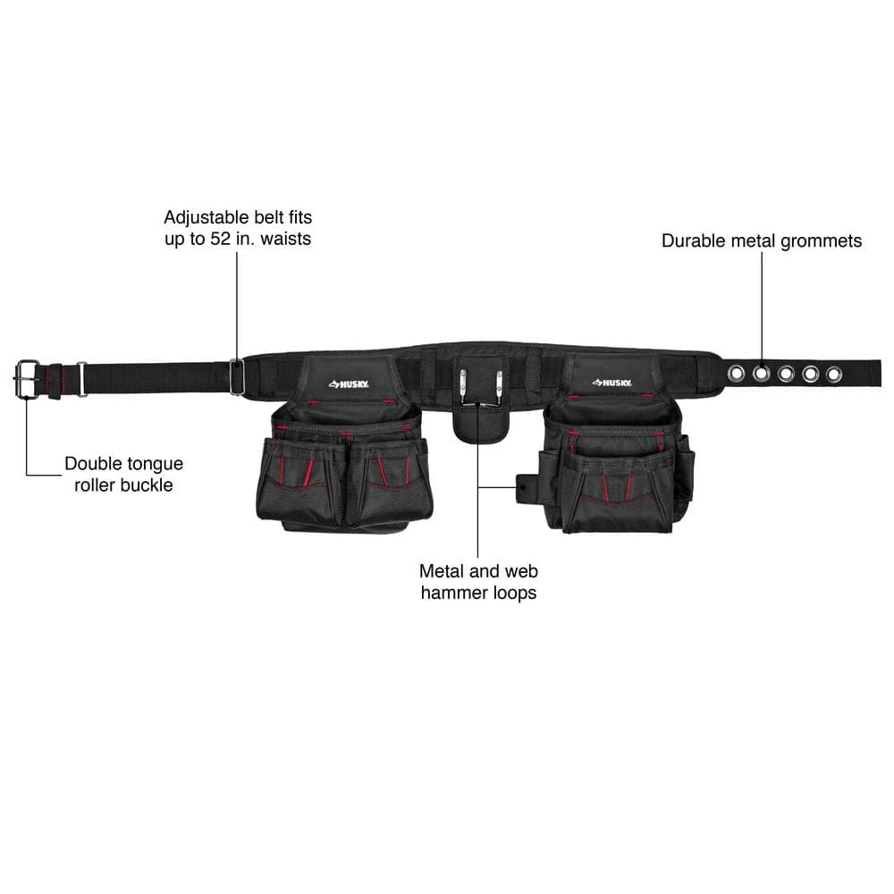 The Husky 10-Pocket Contractor’s 2 Bag Tool belt is made from durable fabric and includes 2 hammer holders in addition to its spacious pockets. This tool belt is ideal for use when working on a job site or a big project at home. It fastens with a double-tongue roller buckle so you know it will be secured on you. This Husky 10 pocket tool belt is made with durable polyester fabric.