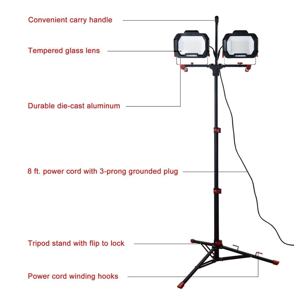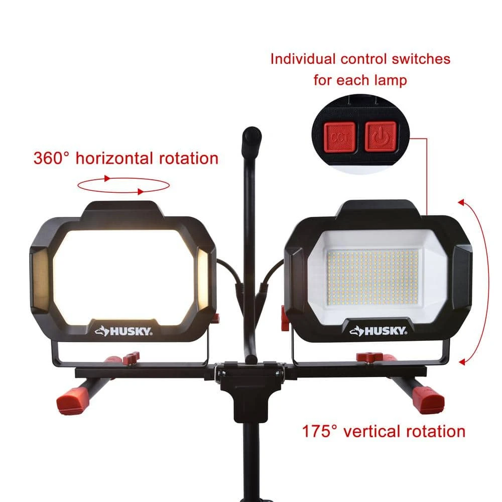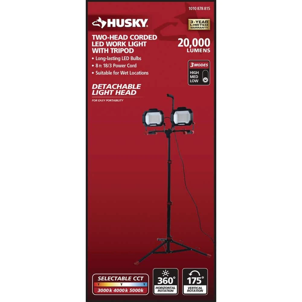 The Husky 20,000 Lumen Two-Head Corded LED Work Light with Tripod is an LED light that goes wherever you go. It’s made of durable, die-cast aluminum, making it strong and reliable. Features color changing technology, allowing you to select between 3 shades of light, from warm white to cool white. With bright LED up to 20,000 Lumens and 3 brightness settings provides flexibility light output. Both lights can be operated independently, and dual lamp heads can be rotated 360ยฐ horizontally and tilted 175ยฐ vertically to face different directions. The telescopic tripod is extendable from 41 inches to 74 inches allowing you to adjust the tripod to any height you want. Exactly position and regulate illumination to your desired height, range and angle. Also convenient to quickly detach the work light from the tripod stand and carry it around for portable work lights, or place it on another surface for more direct light. 8ft power cord provides long reach. Suitable for indoor and outdoor use. Ideal for auto repair, painters, car detailing, construction lighting, and even night market etc. When the job is finished, just it fold up, wrap the cord by using the built-in cord wrap system and easily transport.