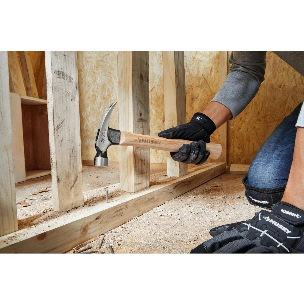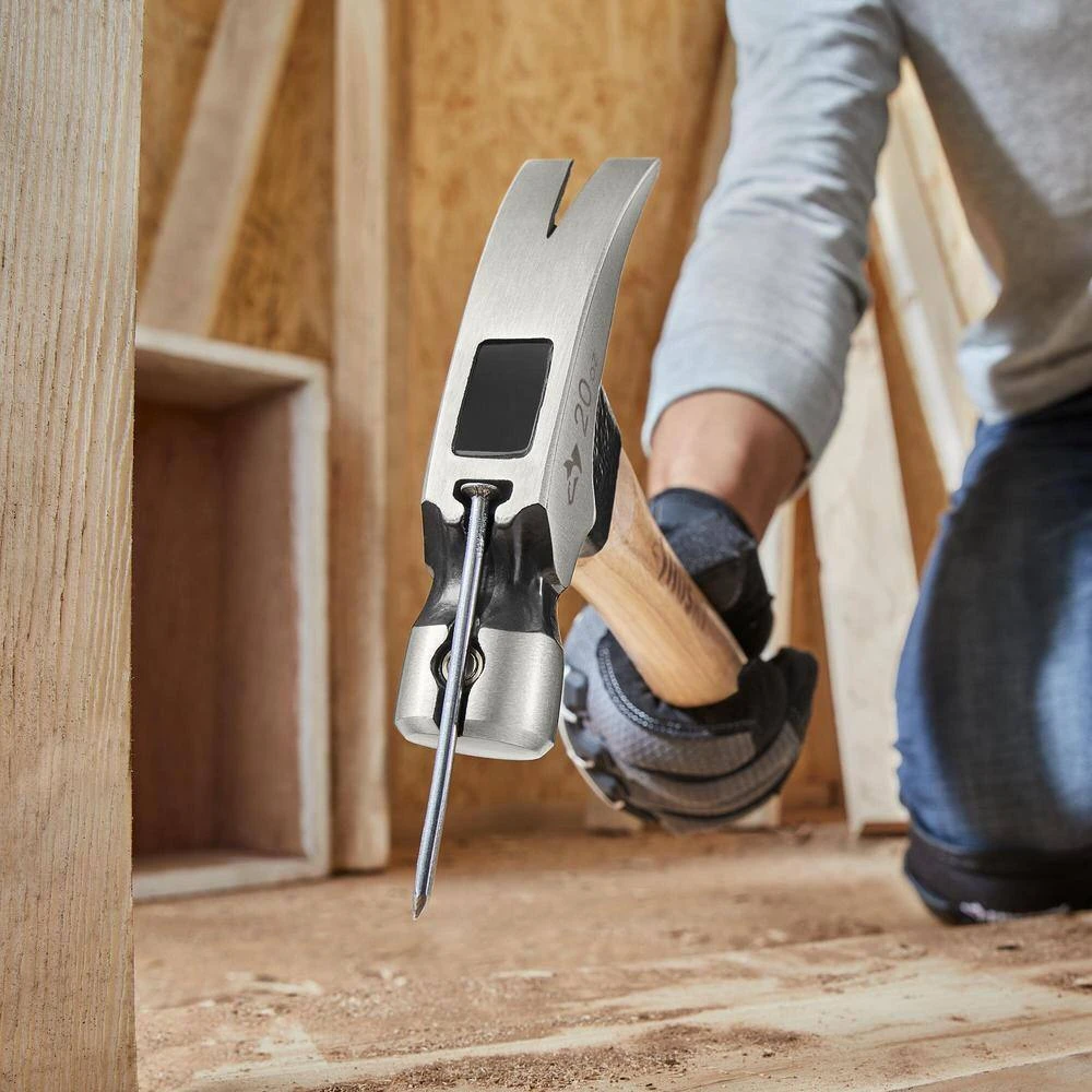 The 20 oz. hammer features a magnetic nail starter that can help you drive nails into areas that can’t be reached by hand. The 20 oz. hammer has a steel head and a hickory handle.Forward weight for efficiency striking.