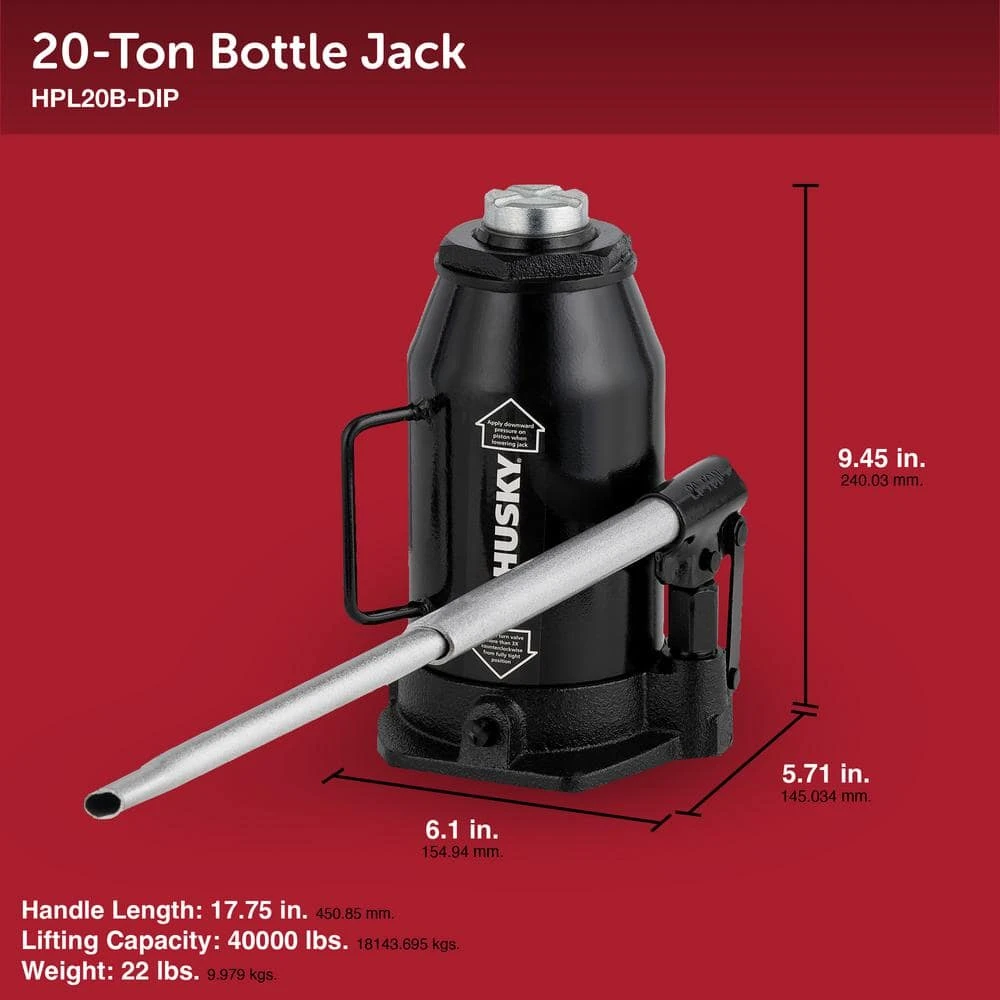 Introducing the robust Husky 20-ton bottle jack, engineered for heavy-duty industrial, automotive, and construction applications. This hydraulic bottle jack boasts an impressive 40,000 lb. lifting capacity and offers a lifting range from 9.5 in. to 17 in., providing versatile lifting capabilities for various tasks. Crafted from heavy-duty iron, the base of this bottle jack is built to withstand the toughest job sites and environments. The adjustable load saddle adds further flexibility, allowing you to position and lift loads efficiently and securely. Make the Husky 20-ton bottle jack a cornerstone of your Husky collection, enhancing your toolkit with a reliable and powerful jack for demanding lifting tasks.