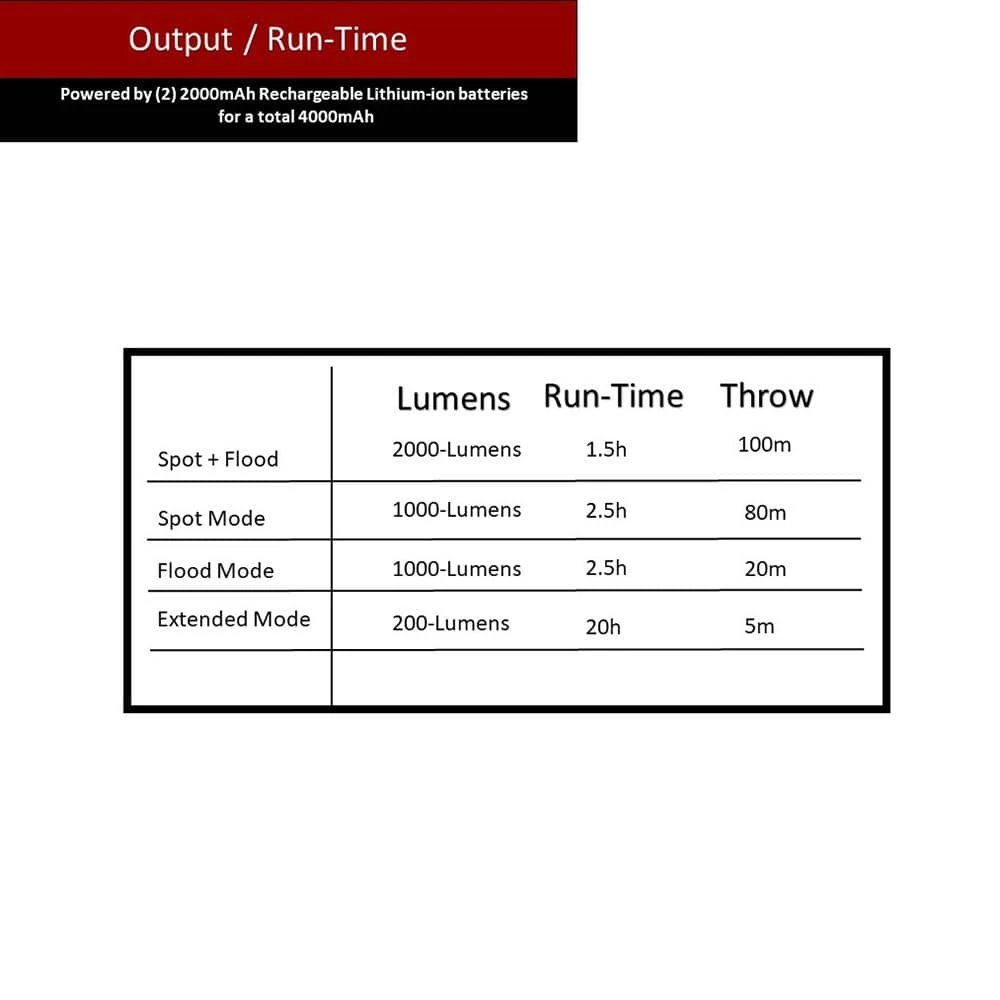 - Specs: (spot and flood mode) 2000-lumens/1.5 hours of run time/100m throw, (spot mode) 1000-lumens/2.5 hours of run time/80m throw, (flood mode) 1000-lumens/2.5 hours of run time/ 20m throw, (Extended) 200- lumens/ 20-hours of run time/5m throw