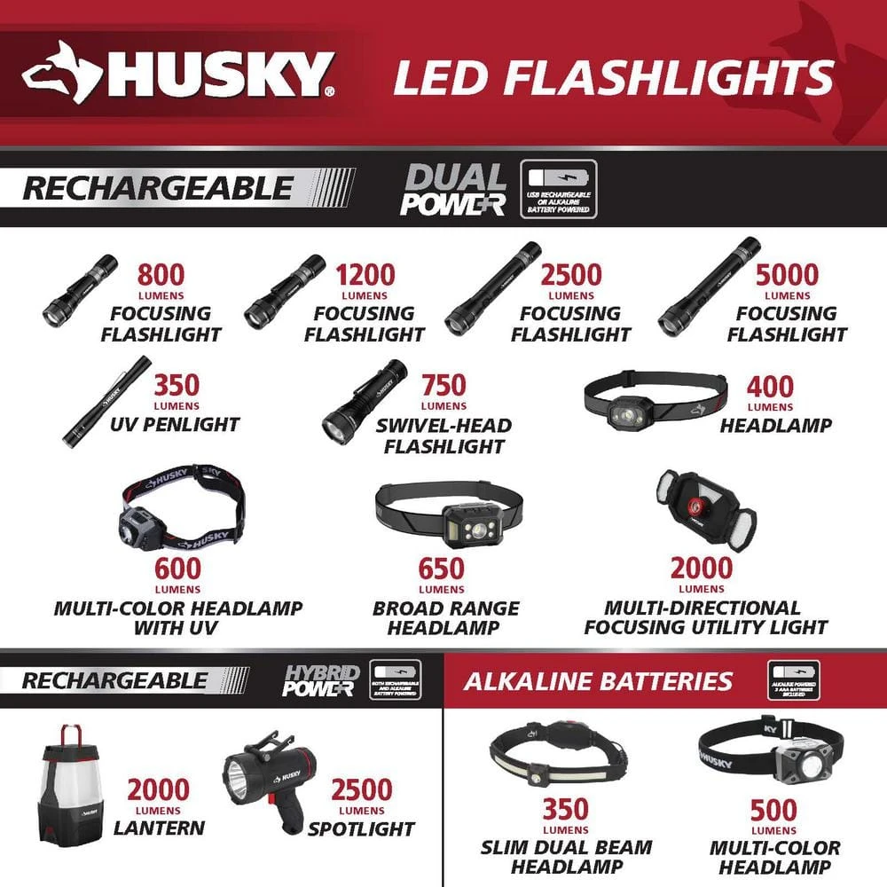 The 2-Pack Husky 2000 Lumens Rechargeable Utility lights feature a 2-panel Multi-Directional light. The 2 panels can rotate 270ยฐ, giving you a wider light angle for your projects. The middle spot- light easily adjusts the focus from flood light to spot- light. Features a 180ยฐ adjustable, foldable handle allowing you to position the light where needed while providing easy to carry convenience. Each light is powered by (2) 2000mAh Rechargeable Lithium-ion batteries for a total 4000mAh. ECO mode for Extended long run time.