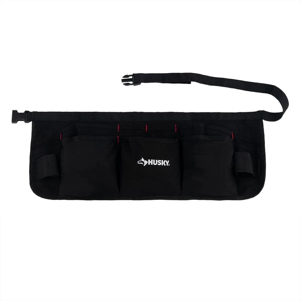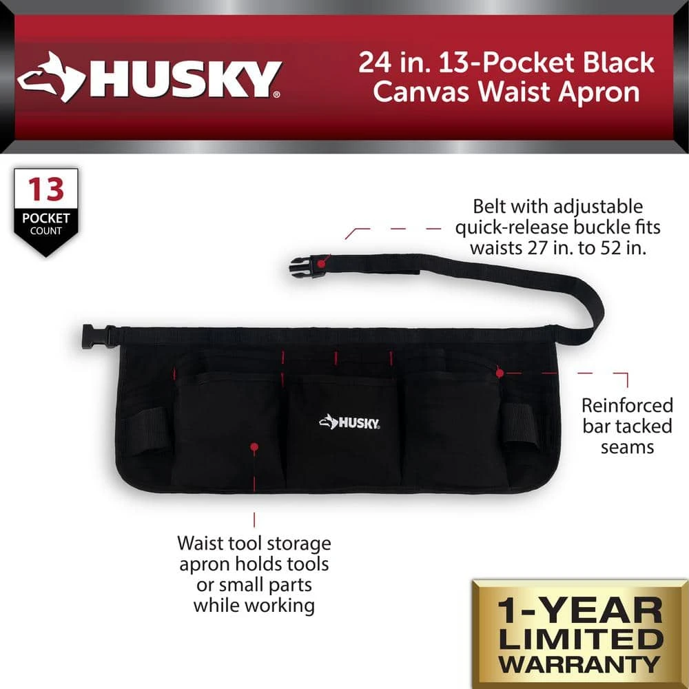 The Husky 24 in. Black Canvas Waist Apron is a great way to hold small tools and other items while working on projects around the house, garage, or in the shop. This black canvas waist apron is constructed of heavy-duty canvas and has 13 pockets. The black canvas waist apron also features bar tacked seams for added durability. The adjustable belt on the black canvas waist apron fits waists 27 in. up to 52 in. and has a quick release buckle. There are also 2 web loops to hold hammers.