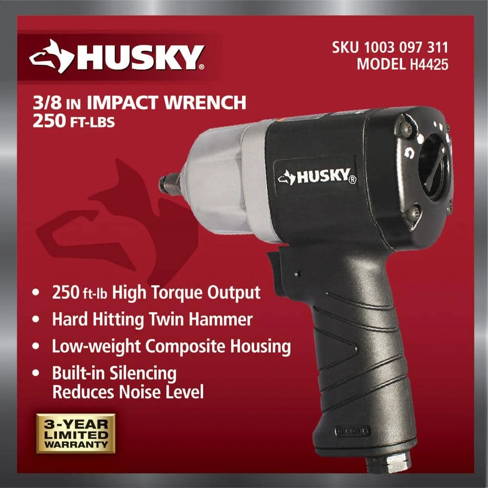 This 250 ft./lbs. 3/8 in. Impact Wrench is built for the professional user, providing more power with less noise. The tool features a low weight composite housing for added user comfort. Each tool produces 250 ft./lbs. of torque. Perfect for auto/recreational vehicle/garden equipment service and repair.