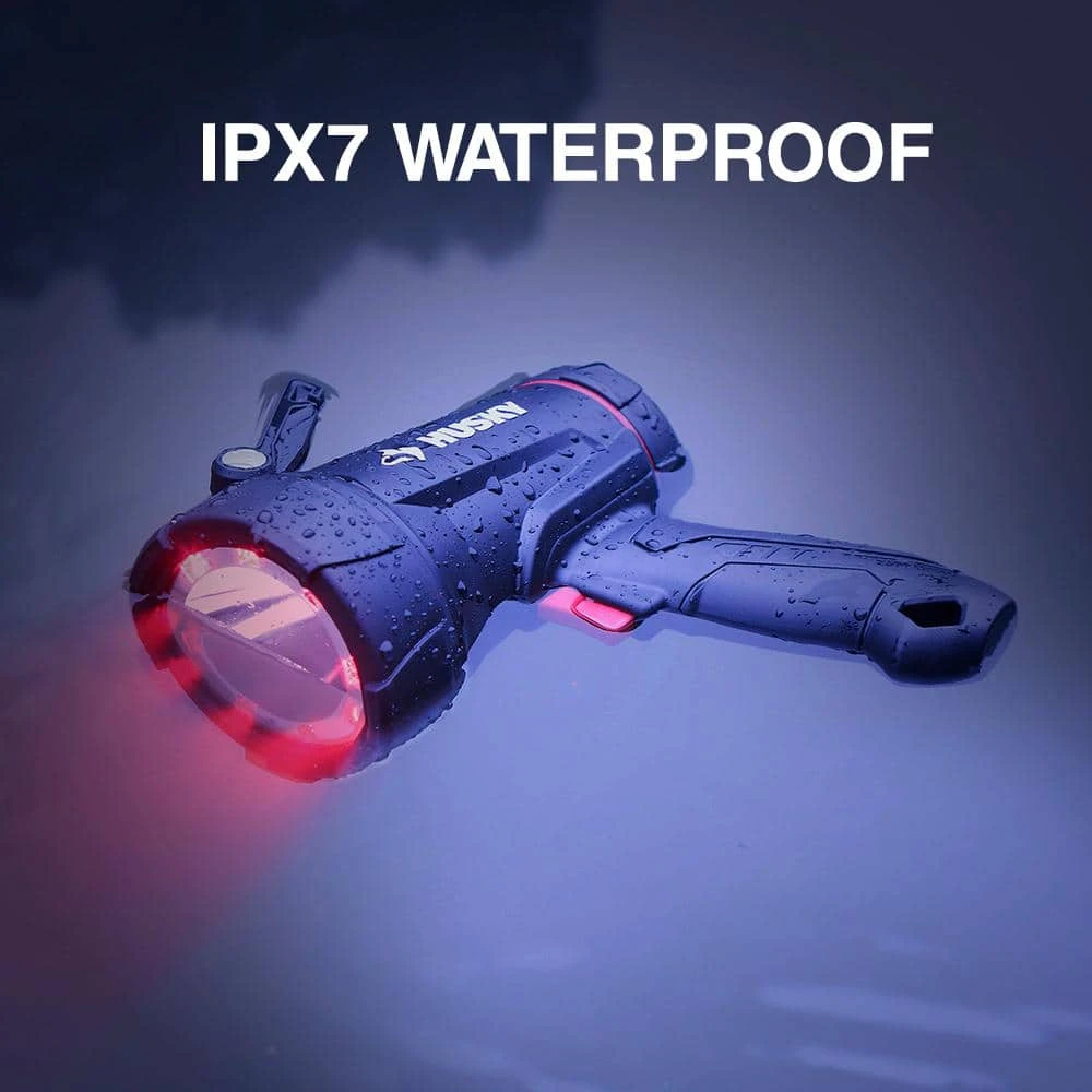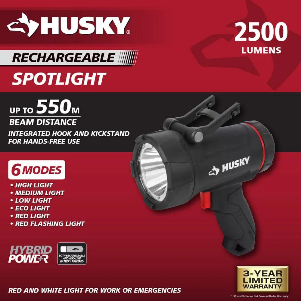 This Husky 2500-Lumens Hybrid Power Floating Rechargeable Spotlight features a compact size spotlight with super bright LED lights. High mode provides up to 2500-Lumens, 550 m throw. The 6-mode capacity provides light options for all your different projects. Modes include: high light, medium light,low light, ECO, red light, and red flashing. High, medium, and low modes provide the right amount of light for your projects, while the red helps with night vision. IPX7 waterproof and floating construction withstands the most extreme weather conditions. This spotlight will automatically flash red when in water. Features include a built-in intergrated hook and kickstand for hands-free Use. Can be powered by either Rechargeable Lithium-Ion Rechargeable Battery or (4) AA Batteries in case of emergency (4 AA Battery not included).Floats and will automatically flash red light when it touches waterSpecs: (high mode) 2500-lumens/ 1.5 hours of run time/ 550m throw; (medium mode) 1200-lumens/3 hours of run time/ 400m throw; (low mode) 500-lumens /5 hours of run time /300m throw; (ECO) 80-lumens /80 hours of run time /80m throwPowered by Either Rechargeable Lithium-Ion Rechargeable Battery or (4) AA Batteries in case of emergency (4 AA Battery not included)ECO mode for Extended long run timeUSB cable included