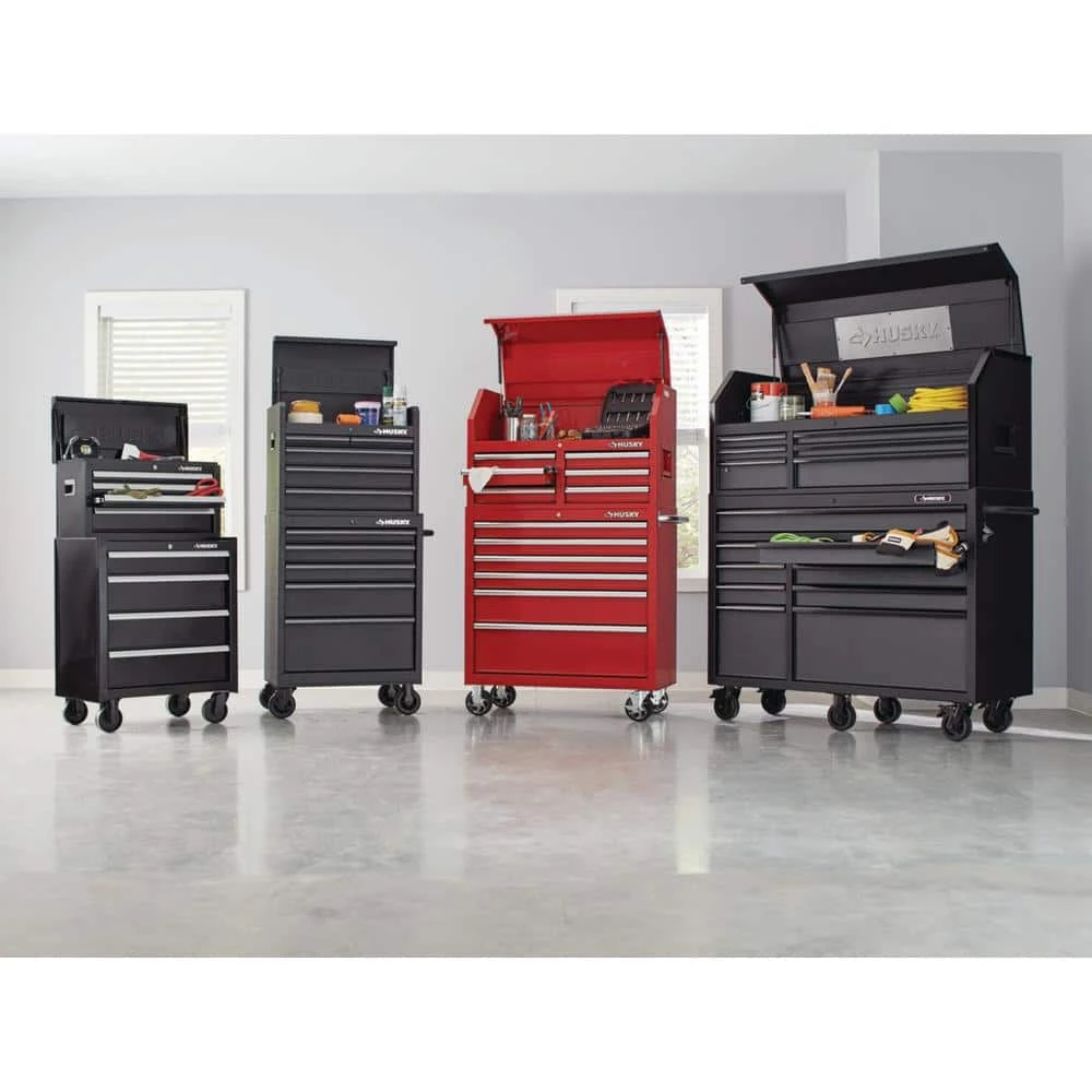 This Husky 26 in. W 4-Drawer Tool Chest is perfect for all of your storage needs. Durable 50 lbs. ball-bearing drawers with smooth detent retention, full width drawer trim and included drawer liners provide easy access and organization when you need it, while the internal locking system provides security when you are away. Gas struts keep the lid open during use and a custom Husky embossed stiffener provides extra stability to the lid.