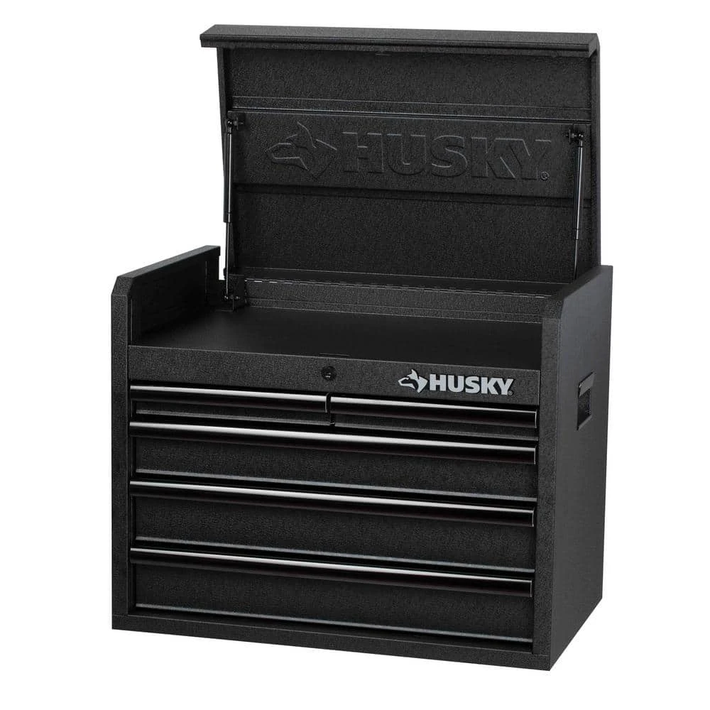Make the best use of your garage with the efficiently designed Husky 26 in. 5-Drawer Tool Chest in Textured Black. Great for holding heavy equipment, this tool chest is built with an all-welded steel construction to offer increased durability. This tool chest has a textured powder coat paint finish that features rust-resistant properties, which adds a protective layer to your unit to ensure your hardware remains secure when not in use. It has a 25.9 in. W x 15.7 in. D x 2.5 in. H lid that features gas struts, providing improved safety when opening and closing. It features 5-drawers – 2 small, 2 medium and 1 large and features a total holding capacity of 5,113 cu. in., offering plenty of storage for all your equipment. Perfect for effortless closing and opening, this Husky high-quality tool chest is made with soft-closing ball bearing slides that can hold up to 100 lbs. to handle heavy loads. This high-quality tool chest is made with an internal locking system with 2 keys, designed to offer you peace of mind. Designed to occupy less space, it features 2 recessed handles, so you can place it in any corner of your workshop. Stay organized on every job with the Husky 26 in. 5-Drawer Tool Chest in Textured Black.