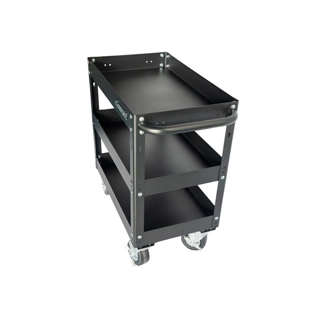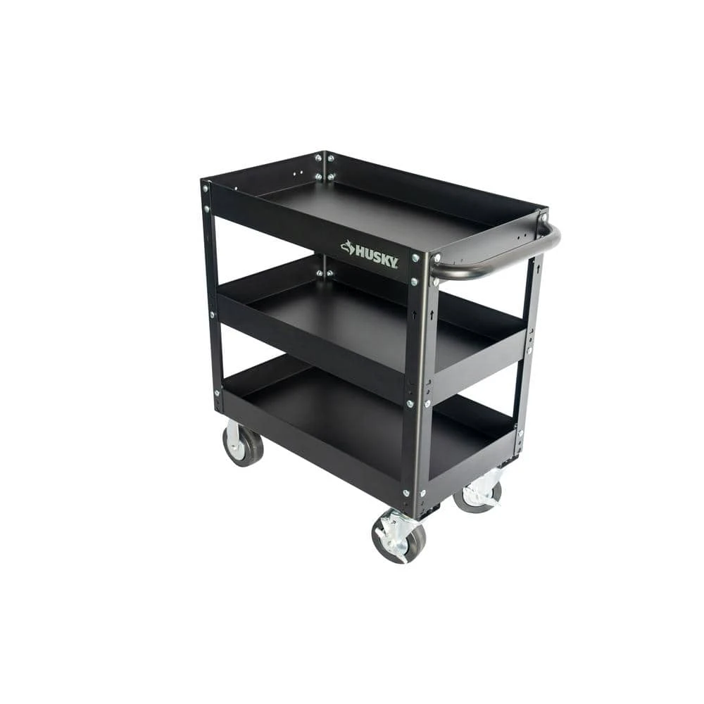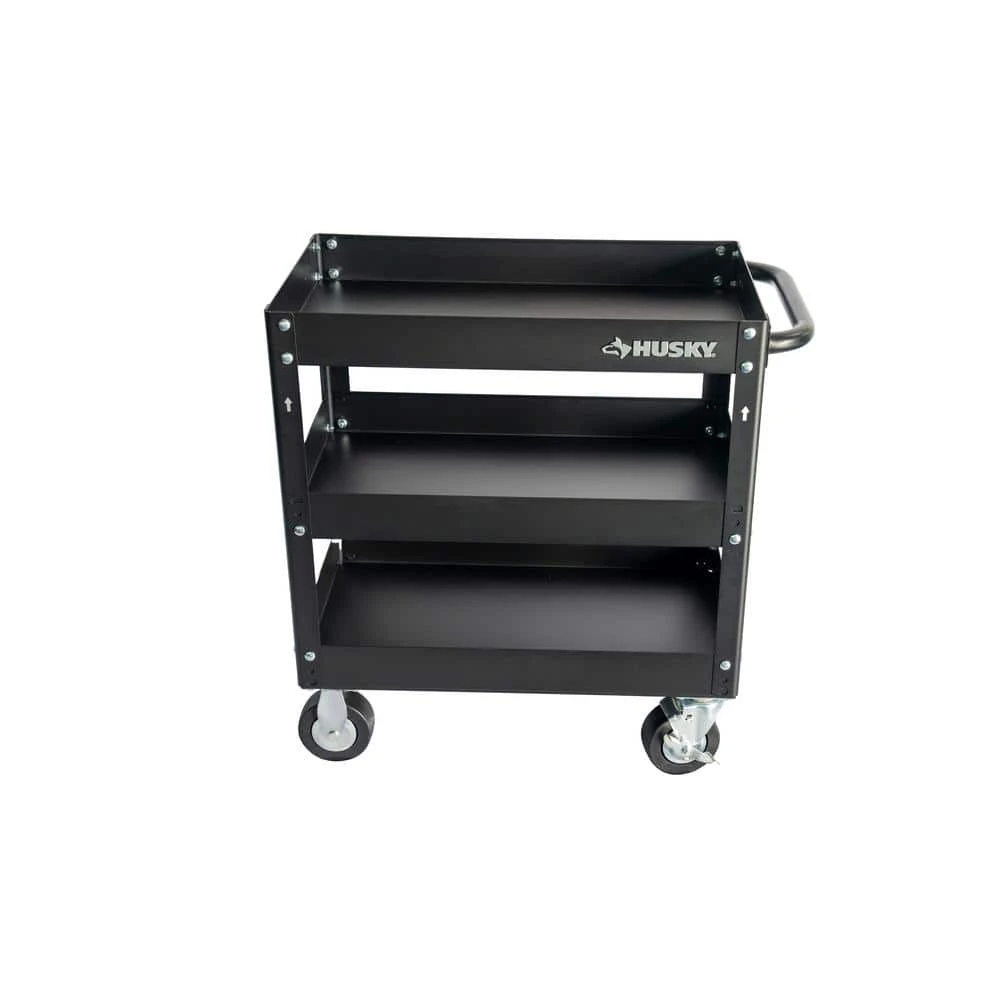 The Husky 28 in. wide 17 in. deep 3 tier mechanics tool cart is a utility cart that is essential in the shop, garage or even the office. The cart has 3 trays to hold a variety of tools. The trays are a perfect place to keep your commonly used items easily within reach. The larger, push-bar handle and heavy-duty, 5 in. x 2 in. casters allow this cart to be easily moved around your work area. With no clumsy washers and nuts to deal with, this tool cart can be assembled in minutes with the included bolts and pre-mounted threads. This cart has 13,426 cu. in. storage capacity.