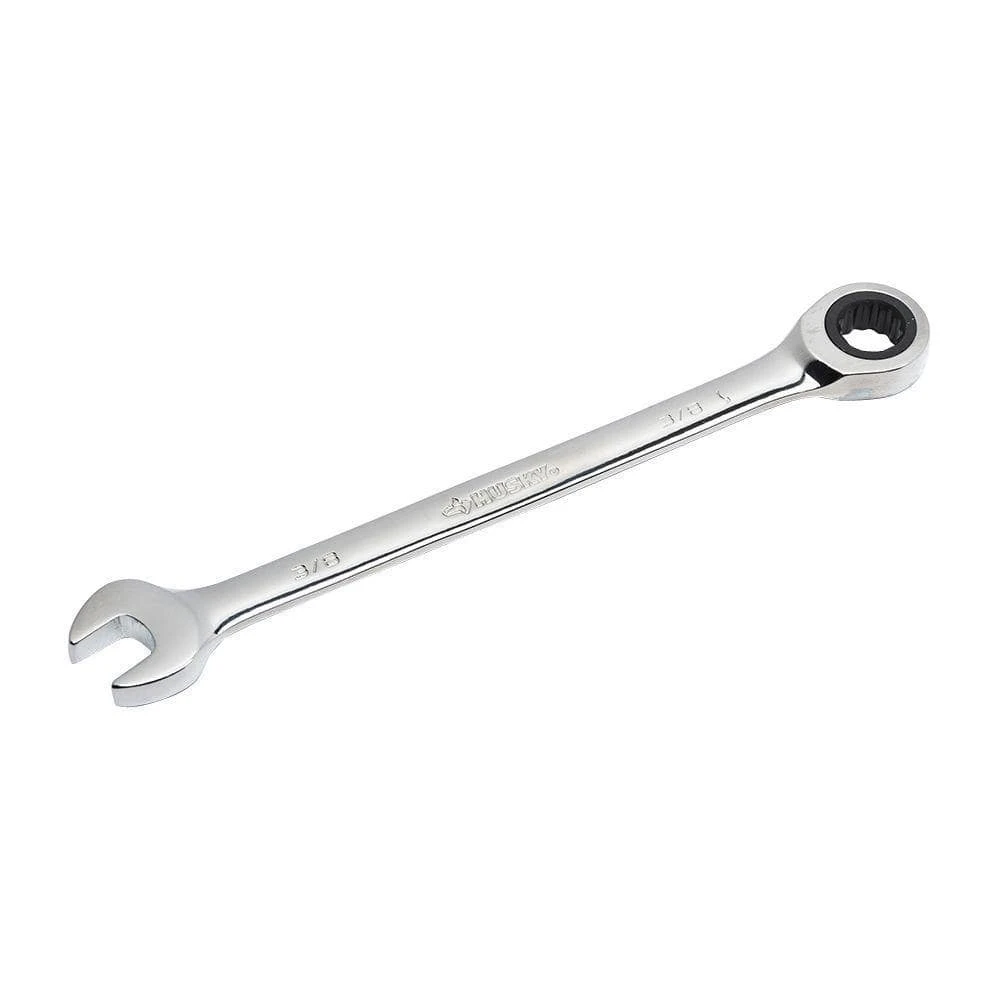 Husky’s ratcheting combination wrenches feature a 12-point, 72-tooth ratcheting box end that needs only 5ยฐ to engage fasteners. Each wrench is manufactured from chrome alloy steel and heat treated for added strength and wear protection; providing durability for a lifetime of hard use. Their polished chrome finish resist rust and corrosion and easily wipes clean of oil and dirt. Both the open and box end features chamfered lead ins for quick and easy placement onto fasteners every time.